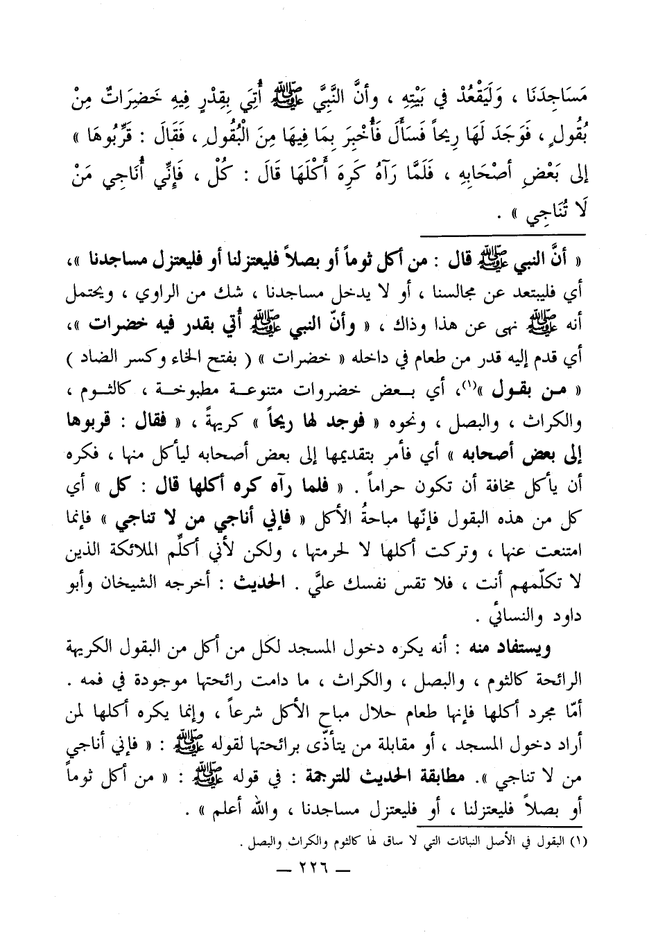 مَسَاجِدَنَا، وَلَيَقْعُدْ في بَيْيهِ، وأنَّ النَّبِيَّ - صلى الله عليه وسلم - أتِيَ بِقِدْرٍ فِيهِ خَضِرَاتٌ مِنْ بُقُول، فَوَجَدَ لَهَا رِيحاً فَسَألَ فَأخبر خْبِرَ بِمَا فِيهَا مِنَ الْبُقُولِ، فَقَالَ: قَرِّبُوهَا"