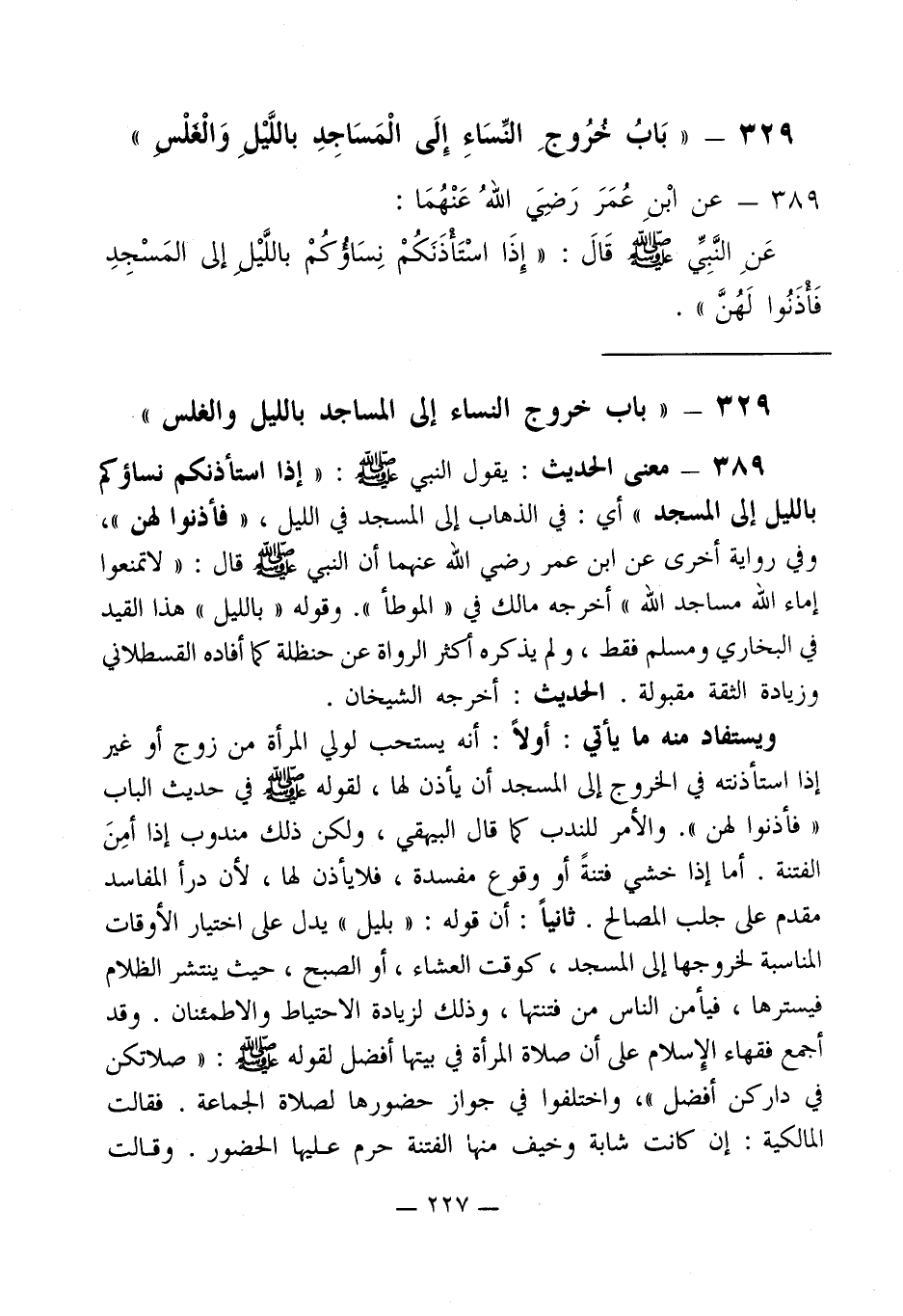 329 - " بَابُ خرُوجِ النِّسَاءِ إِلَى الْمَسَاجِدِ باللَّيْلِ وَالْغلْسِ "