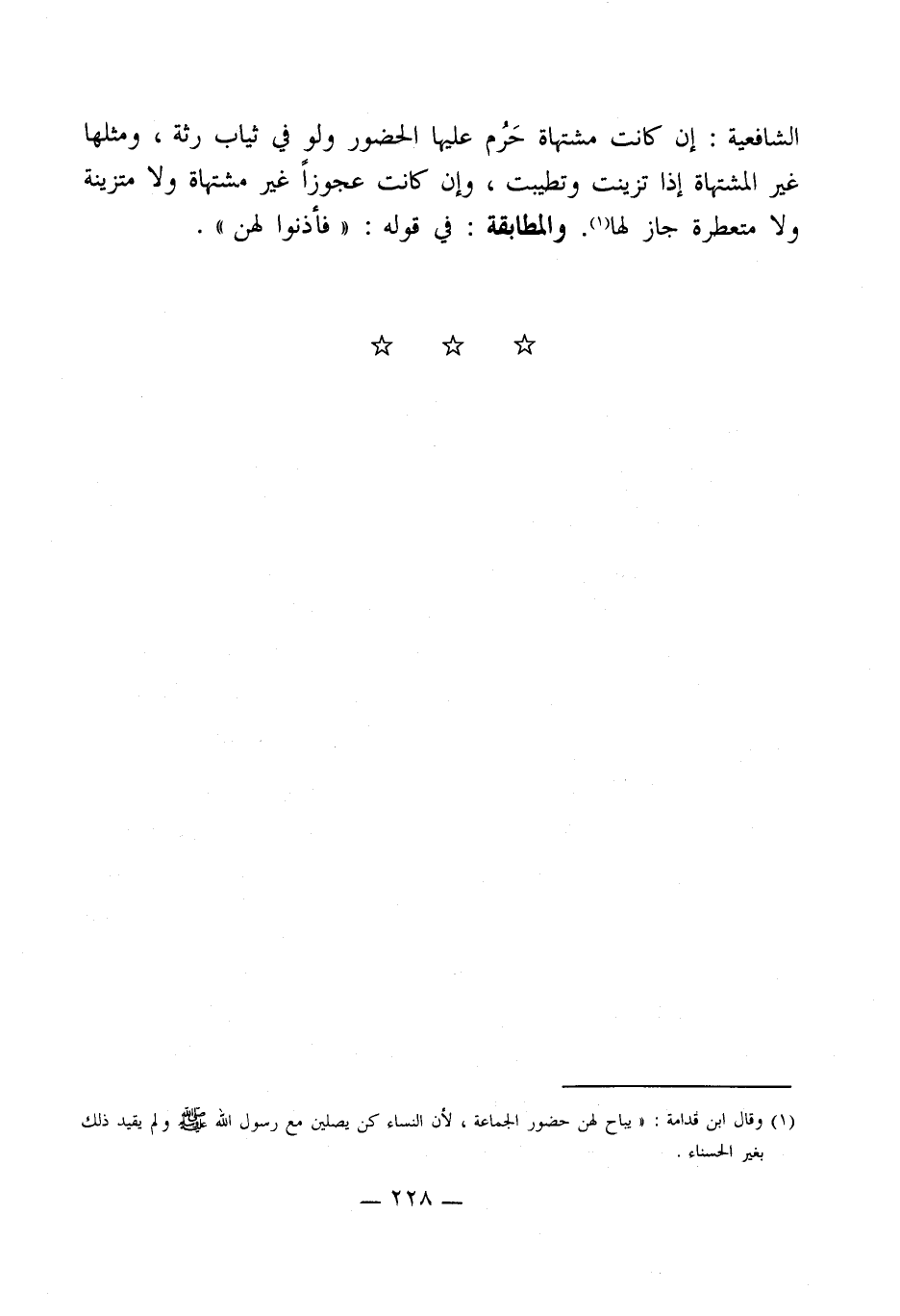 (¬1) وقال ابن قدامة: " يباح لهن حضور الجماعة، لأن النساء كن يصلين مع رسول الله - صلى الله عليه وسلم - ولم يقيد ذلك بغير الحسناء.