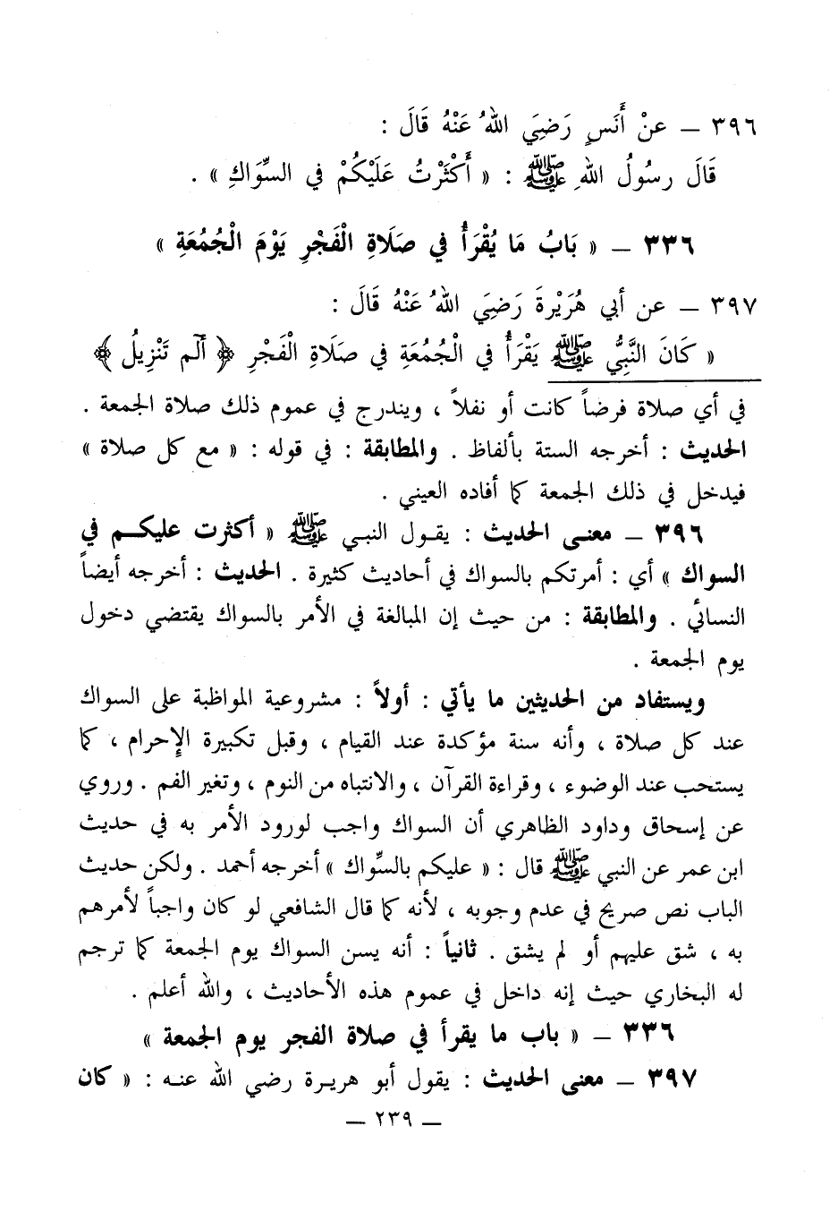"كَانَ النَّبِيُّ - صلى الله عليه وسلم - يَقْرأ في الْجُمُعَةِ في صَلَاةِ الْفَجْرِ (الم (1) تَنْزِيلُ)