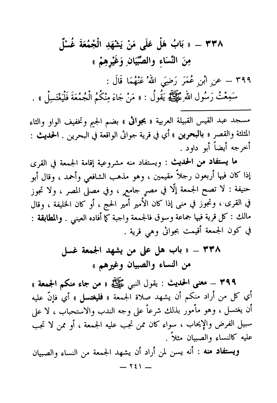 338 - "بَابُ هَلْ عَلَى مَنْ يَشْهَدِ الْجُمُعَةَ غُسْل مِنَ النِّسَاءِ والصبيَانِ وَغَيْرِهِمْ "