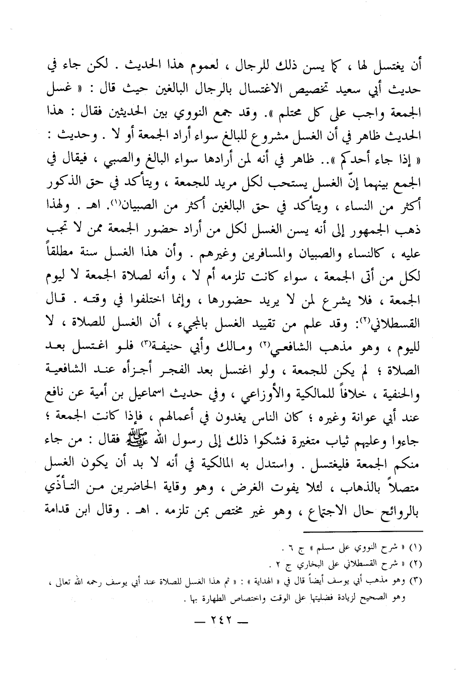 أن يغتسل لها، كما يسن ذلك للرجال، لعموم هذا الحديث. لكن جاء في حديث أبي سعيد تخصيص الاغتسال بالرجال البالغين حيث قال: " غسل الجمعة واجب على كل محتلم ". وقد جمع النووي بين الحديثين فقال: هذا الحديث ظاهر في أن الغسل مشروع للبالغ سواء أراد الجمعة أو لا. وحديث: " إذا جاء أحدكم " .. ظاهر في أنه لمن أرادها سواء البالغ والصبي، فيقال في الجمع بينهما إنّ الغسل يستحب لكل مريد للجمعة، ويتأكد في حق الذكور أكثر من النساء، ويتأكد في حق البالغين أكثر من الصبيان (¬1). اهـ. ولهذا ذهب الجمهور إلى أنه يسن الغسل لكل من أراد حضور الجمعة ممن لا تجب عليه، كالنساء والصبيان والمسافرين وغيرهم. وأن هذا الغسل سنة مطلقاً لكل من أَتى الجمعة، سواء كانت تلزمه أم لا، وأنه لصلاة الجمعة لا ليوم الجمعة، فلا يشرع لمن لا يريد حضورها، وإنما اختلفوا في وقته. قال القسطلاني (2): وقد علم من تقييد الغسل بالمجيء، أن الغسل للصلاة، لا لليوم، وهو مذهب الشافعي (¬2) ومالك وأبي حنيفة (¬3) فلو اغتسل بعد الصلاة؛ لم يكن للجمعة، ولو اغتسل بعد الفجر أجزأه عند الشافعية والحنفية، خلافاً للمالكية والأوزاعي، وفي حديث اسماعيل بن أمية عن نافع عند أبي عوانة وغيره؛ كان الناس يغدون في أعمالهم، فإذا كانت الجمعة؛ جاءوا وعليهم ثياب متغيرة فشكوا ذلك إلى رسول الله - صلى الله عليه وسلم - فقال: من جاء منكم الجمعة فليغتسل. واستدل به المالكية في أنه لا بد أن يكون الغسل متصلاً بالذهاب، لئلا يفوت الغرض، وهو وقاية الحاضرين من التأذّي بالروائح حال الاجتماع، وهو غير مختص بمن تلزمه. اهـ. وقال ابن قدامة
