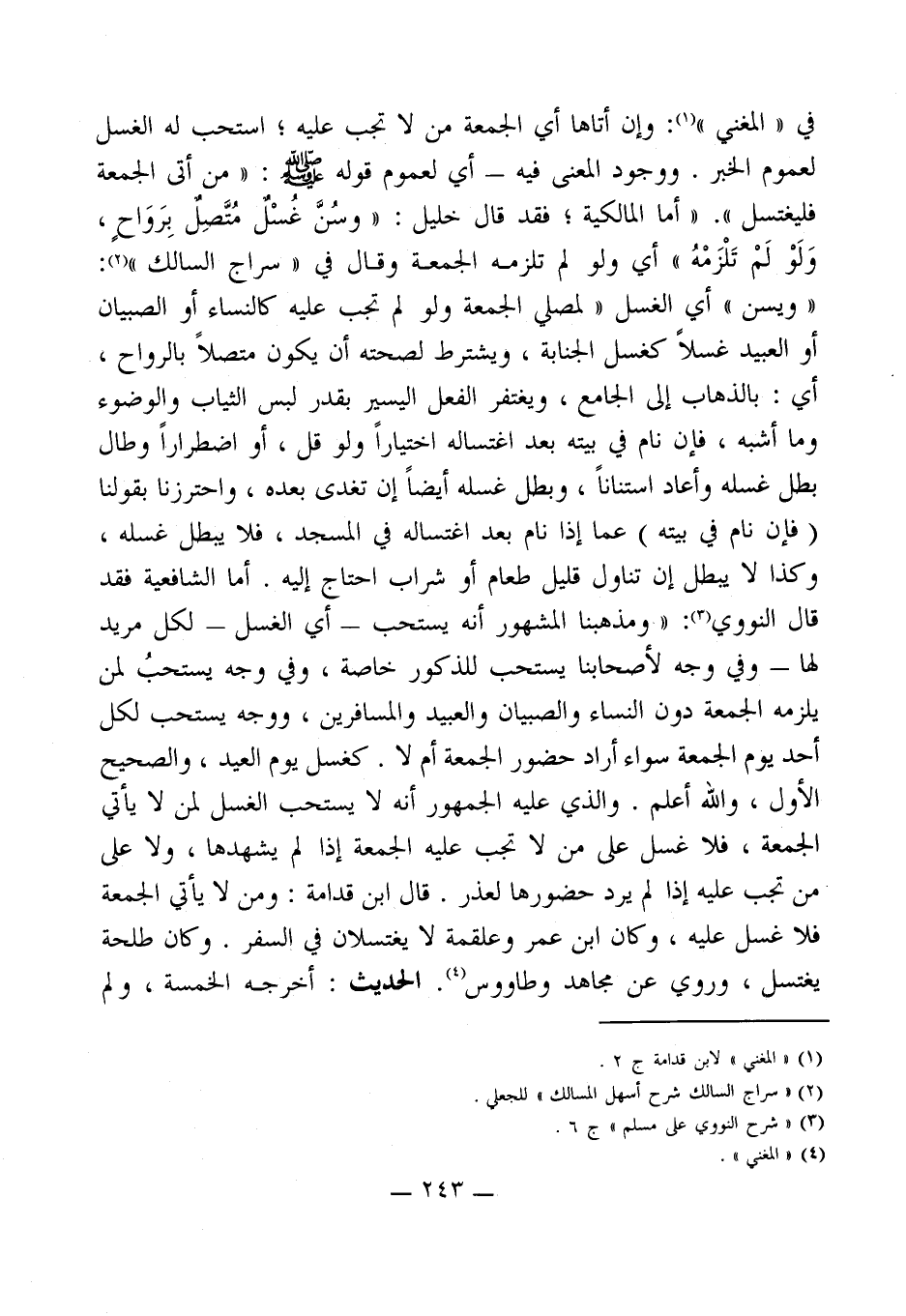 في " المغني " (¬1): وإن أتاها أي الجمعة من لا تجب عليه؛ استحب له الغسل لعموم الخبر. ووجود المعنى فيه - أي لعموم قوله - صلى الله عليه وسلم -: " من أتى الجمعة فليغتسل ". " أما المالكية؛ فقد قال خليل: " وسُنَّ غُسْلٌ مُتَّصِلٌ بِرَوَاح، وَلَوْ لَمْ تَلْزَمْهُ " أي ولو لم تلزمه الجمعة وقال في " سراج السالك " (¬2): " ويسن " أي الغسل " لمصلي الجمعة ولو لم تجب عليه كالنساء أو الصبيان أو العبيد غسلاً كغسل الجنابة، ويشترط لصحته أن يكون متصلاً بالرواح، أي: بالذهاب إلى الجامع، ويغتفر الفعل اليسير بقدر لبس الثياب والوضوء وما أشبه، فإن نام في بيته بعد اغتساله اختياراً ولو قل، أو اضطراراً وطال بطل غسله وأعاد استناناً، وبطل غسله أيضاً إن تغدى بعده، واحترزنا بقولنا (فإن نام في بيته) عما إذا نام بعد اغتساله في المسجد، فلا يبطل غسله، وكذا لا يبطل إن تناول قليل طعام أو شراب احتاج إليه. أما الشافعية فقد قال النووي (¬3): ". ومذهبنا المشهور أنه يستحب -أي الغسل- لكل مريد لها - وفي وجه لأصحابنا يستحب للذكور خاصة، وفي وجه يستحبُ لمن يلزمه الجمعة دون النساء والصبيان والعبيد والمسافرين، ووجه يستحب لكل أحد يوم الجمعة سواء أراد حضور الجمعة أم لا. كغسل يوم العيد، والصحيح الأول، والله أعلم. والذي عليه الجمهور أنه لا يستحب الغسل لمن لا يأتي الجمعة، فلا غسل على من لا تجب عليه الجمعة إذا لم يشهدها، ولا على من تجب عليه إذا لم يرد حضورها لعذر. قال ابن قدامة: ومن لا يأتي الجمعة فلا غسل عليه، وكان ابن عمر وعلقمة لا يغتسلان في السفر. وكان طلحة يغتسل، وروي عن مجاهد وطاووس (¬4). الحديث: أخرجه الخمسة، ولم