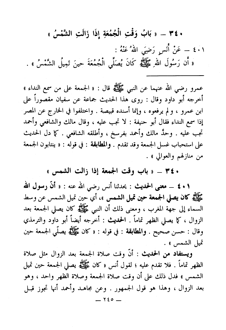 401 - معنى الحديث: يحدثنا أنس رضي الله عنه: " أنّ رسول الله - صلى الله عليه وسلم - كان يصلي الجمعة حين تحل الشمس "، أي حين تميل الشمس عن وسط السماء إلى جهة المغرب، ومعنى ذلك أن النبي - صلى الله عليه وسلم - كان يصلي الجمعة بعد الزوال، كما يصلي الظهر تماماً. الحديث: أخرجه أيضاً أبو داود والترمذي وقال: حسن صحيح. والمطابقة: في قوله: " كان - صلى الله عليه وسلم - يصلّي الجمعة حين تميل الشمس ".