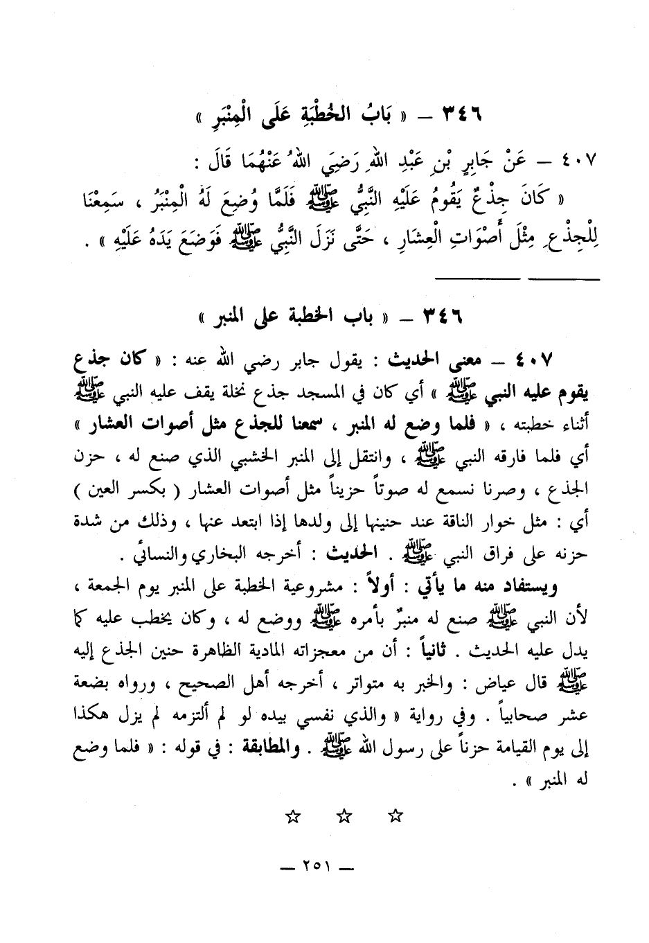 407 - معنى الحديث: يقول جابر رضي الله عنه: " كان جذع يقوم عليه النبي - صلى الله عليه وسلم - " أي كان في المسجد جذع نخلة يقف عليه النبي - صلى الله عليه وسلم - أثناء خطبته، " فلما وضع له المنبر، سمعنا للجذع مثل أصوات العشار " أي فلما فارقه النبي - صلى الله عليه وسلم -، وانتقل إلى المنبر الخشبي الذي صنع له، حزن الجذع، وصرنا نسمع له صوتاً حزيناً مثل أصوات العشار (بكسر العين) أى: مثل خوار الناقة عند حنينها إلى ولدها إذا ابتعد عنها، وذلك من شدة حزنه على فراق النبي - صلى الله عليه وسلم -. الحديث: أخرجه البخاري والنسائي.