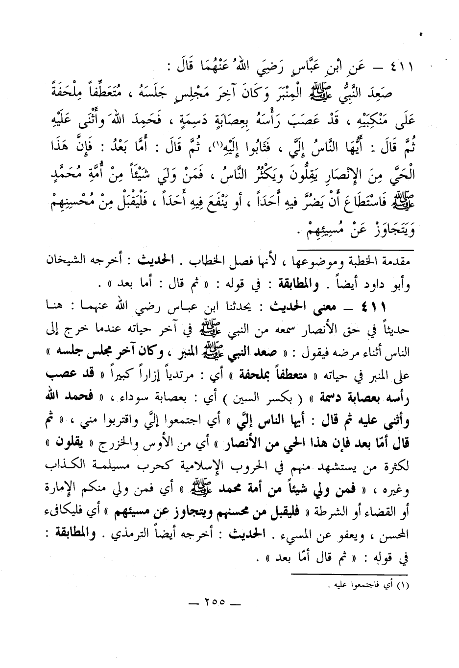 411 - معنى الحديث: يحدثنا ابن عباس رضي الله عنهما: هنا حديثاً في حق الأنصار سمعه من النبي - صلى الله عليه وسلم - في آخر حياته عندما خرج إلى الناس أثناء مرضه فيقول: " صعد النبي - صلى الله عليه وسلم - المنبر، وكان آخر مجلس جلسه " على المنبر في حياته " متعطفاً بملحفة " أي: مرتدياً إزاراً كبيراً " قد عصب رأسه بعصابة في دسمة " (بكسر السين) أي بعصابة سوداء، " فحمد الله وأثنى عيه ثم قآل: أيها الناس إليَّ " أي اجتمعوا إليَّ واقتربوا مني، " ثم قال أمّا بعد فإن هذا الحي من الأنصار " أي من الأوس والخزرج " يقلون " لكثرة من يستشهد منهم في الحروب الإسلامية كحرب مسيلمة الكذاب وغيره، " فمن ولي شيئاً من أمة محمد - صلى الله عليه وسلم - " أي فمن ولي منكم الإمارة أو القضاء أو الشرطة " فليقبل من محسنهم ويتجاوز عن مسيئهم " أي فليكافىء المحسن، ويعفو عن المسيء. الحديث: أخرجه أيضاً الترمذي. والمطابقة: في قوله: " ثم قال أمّا بعد ".