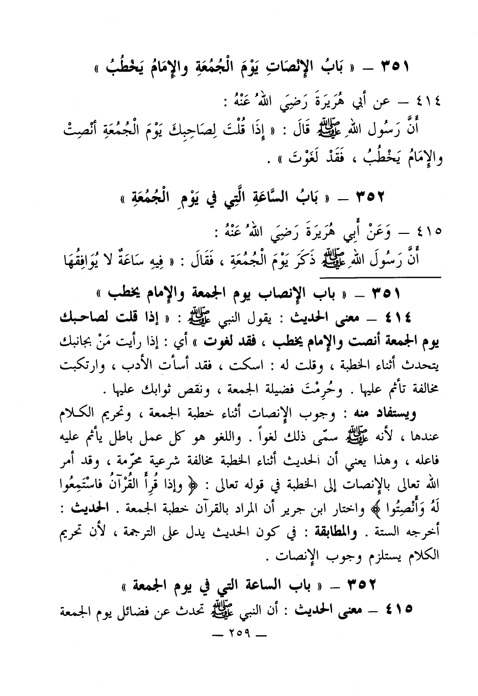 351 - " بَابُ الإِنصَاتِ يَوْمَ الْجُمُعَةِ والإِمَامُ يَخطُبُ "