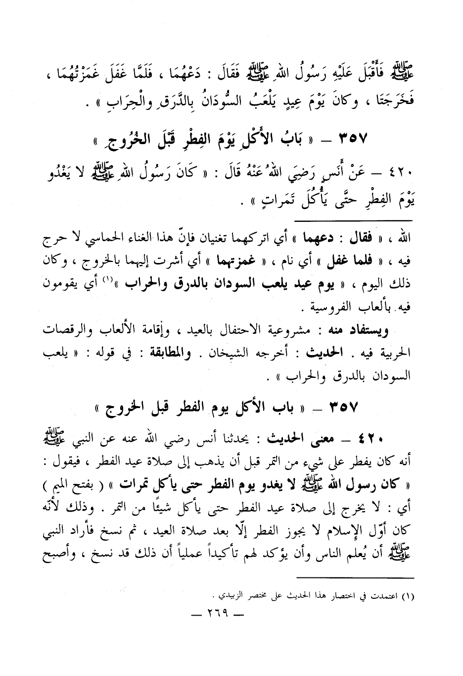 420 - عَنْ أنَسٍ رَضِيَ اللهُ عَنْهُ قَالَ: " كَانَ رَسُولُ اللهِ - صلى الله عليه وسلم - لا يَغْدُو يَوْمَ الفِطر حتَّى يَأكُلَ تَمَراتٍ ".