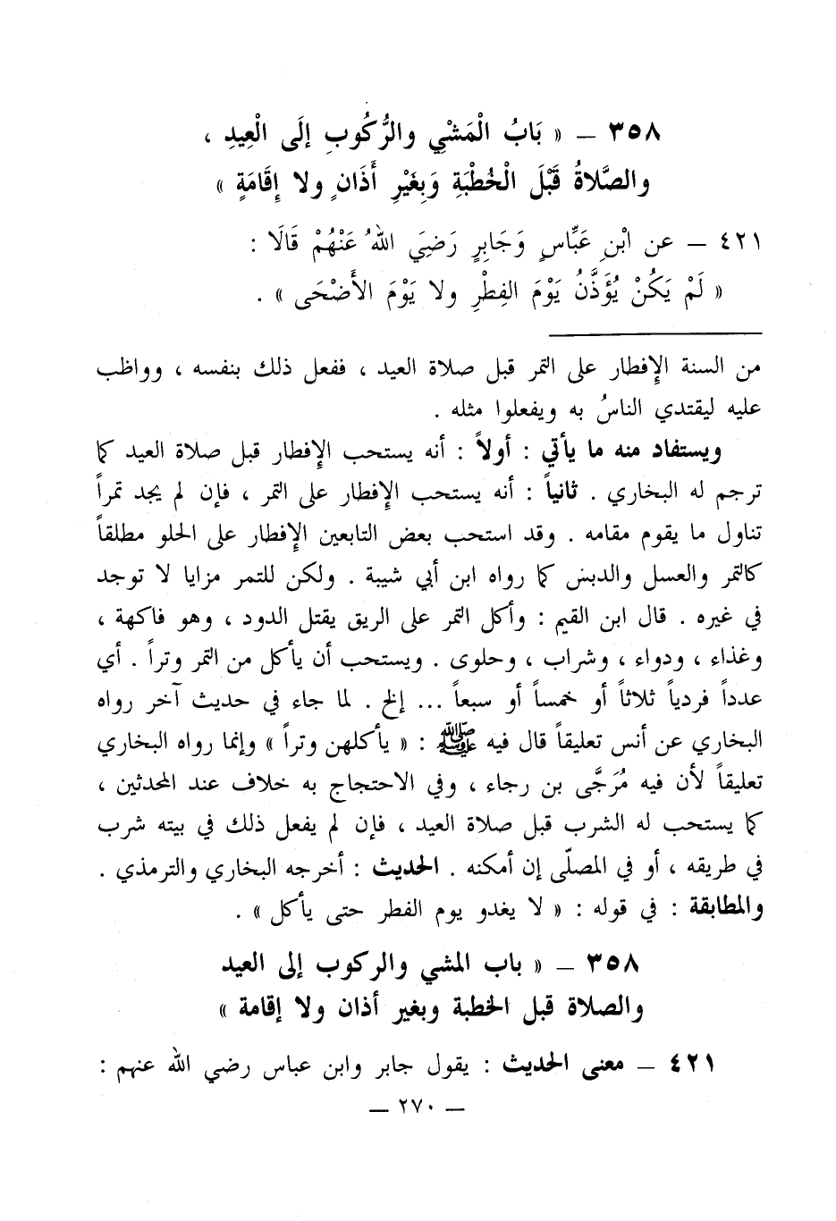358 - " بَابُ الْمَشْيِ والرُّكُوبِ إلَى الْعِيدِ، والصَّلاةُ قَبلَ الْخطْبَةِ وَبِغيْرِ أَذَانٍ ولا إِقَامَةٍ "