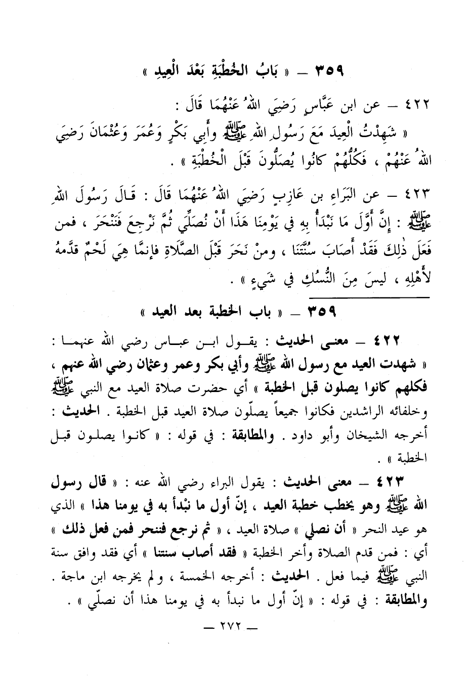 423 - معنى الحديث: يقول البراء رضي الله عنه: " قال رسول الله - صلى الله عليه وسلم - وهو يخطب خطبة العيد، إنّ أول ما نبْدأ به في يومنا هذا " الذي هو عيد النحر " أن نصلي " صلاة العيد، " ثم نرجع فننحر فمن فعل ذلك " أي: فمن قدم الصلاة وأخر الخطبة " فقد أصاب سنتنا " أي فقد وافق سنة النبي - صلى الله عليه وسلم - فيما فعل. الحديث: أخرجه الخمسة، ولم يخرجه ابن ماجة.