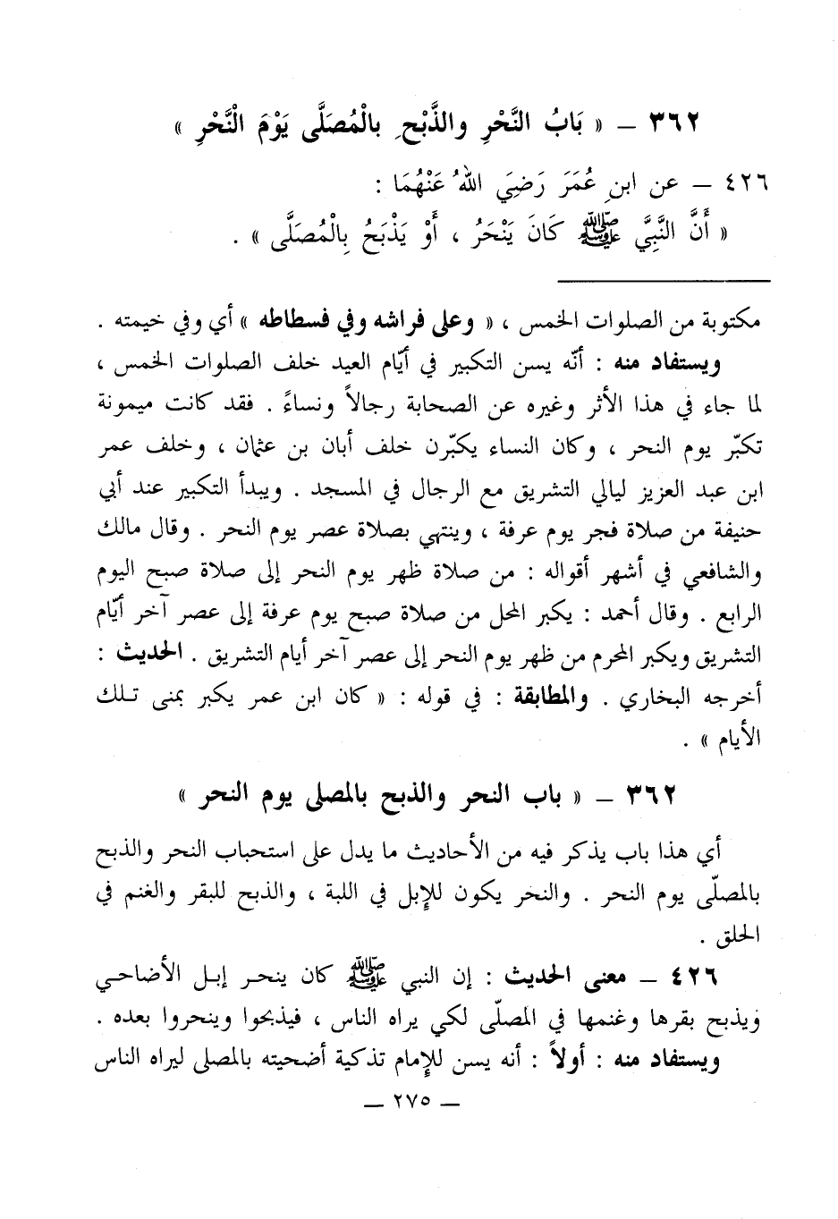 362 - " بَابُ النَّحْرِ والذَّبْحِ بالْمُصَلَّى يَوْم الْنَّحْرِ "