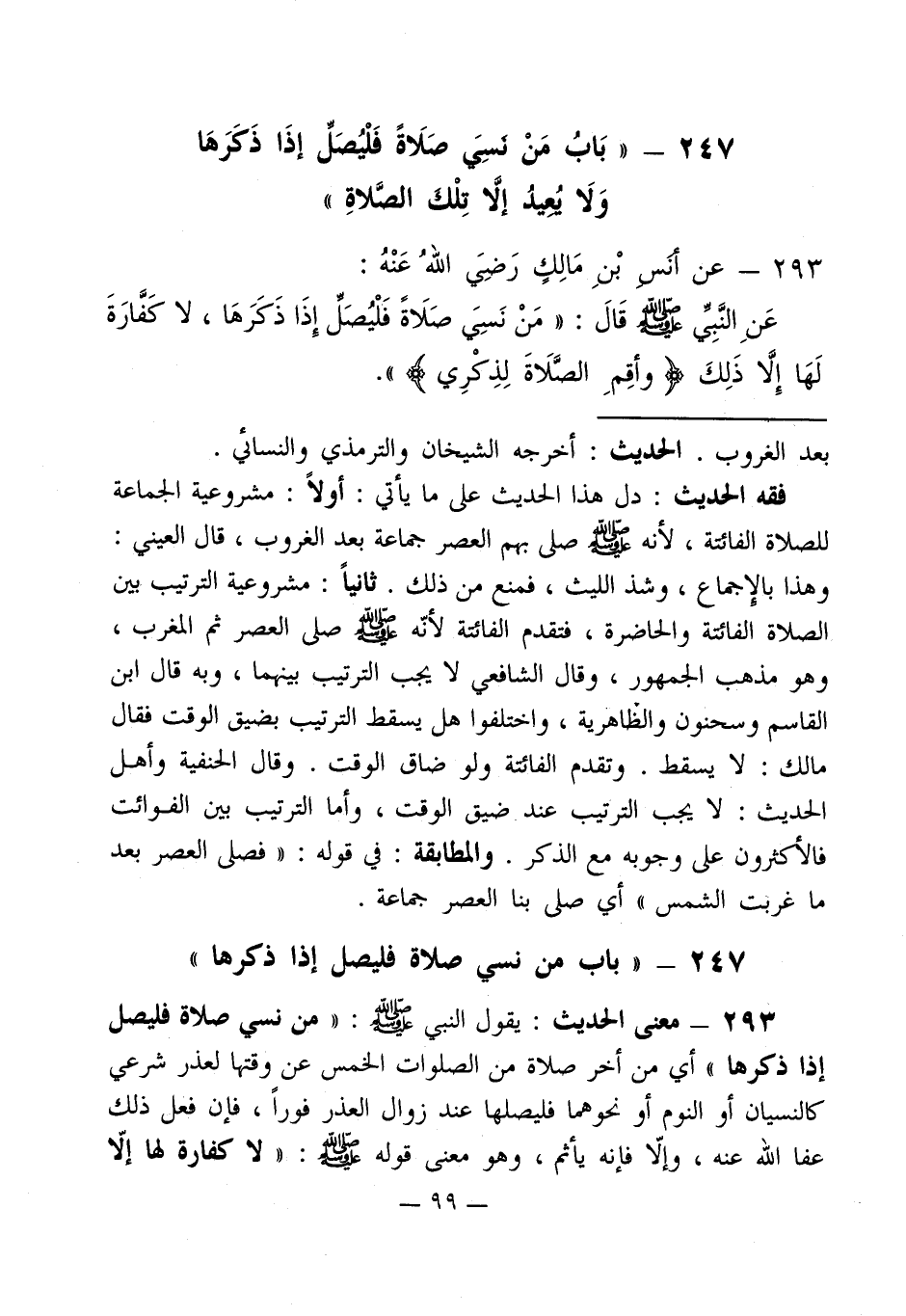 293 - معنى الحديث: يقول النبي - صلى الله عليه وسلم -: " من نسي صلاة فليصل إذا ذكرها " أي من أخر صلاة من الصلوات الخمس عن وقتها لعذر شرعي كالنسيان أو النوم أو نحوهما فليصلها عند زوال العذر فوراً، فإن فعل ذلك عفا الله عنه، وإلّا فإنه يأثم، وهو معنى قوله - صلى الله عليه وسلم -: "لا كفارة لها إلّا