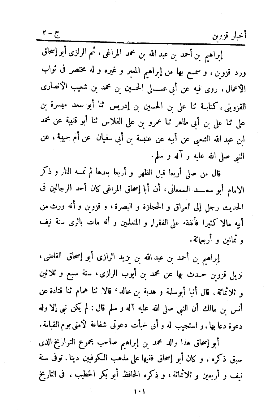 إبراهيم بْن أَحْمَدَ بْن عَبْد اللَّهِ بْنِ مُحَمَّدٍ الْمَرَاغِيُّ ثُمَّ الرَّازِيُّ أَبُو إِسْحَاقَ وَرَدَ قَزْوِينَ وَسَمِعَ بِهَا مِنْ إِبْرَاهِيمَ الْمُعَبِّرِ وَغَيْرِهِ وَلَهُ مُخْتَصَرٌ فِي ثَوَابِ الأَعْمَالِ رَوَى فِيهِ عَنْ أَبِي عَلَى الحسين بْن مُحَمَّد بْن شُعَيْبٍ الأَنْصَارِيِّ الْقَزْوِينِيِّ كِتَابَةً ثنا عَلِيُّ بْنُ الْحُسَيْنِ بْنِ إِدْرِيسَ ثنا أَبُو سَعْدٍ مَيْسَرَةُ بْنُ عَلِيٍّ ثنا عَلِيُّ بْنُ أَبِي طَاهِرٍ ثنا عَمْرُو بْنُ عَلِيٍّ الْفَلاسُ ثنا أَبُو قُتَيْبَةَ عَنْ محمد ابن عَبْدِ اللَّهِ الشَّعْبِيِّ عَنْ أَبِيهِ عَنْ عَنْبَسَةَ بْنِ أَبِي سُفْيَانَ عَنْ أُمِّ حَبِيبَةَ عَنِ النَّبِيِّ صَلَّى اللَّهُ عَلَيْهِ وَآلِهِ وَسَلَّمَ صَلَّى اللَّهُ عَلَيْهِ وَآلِهِ وَسَلَّمَ.
