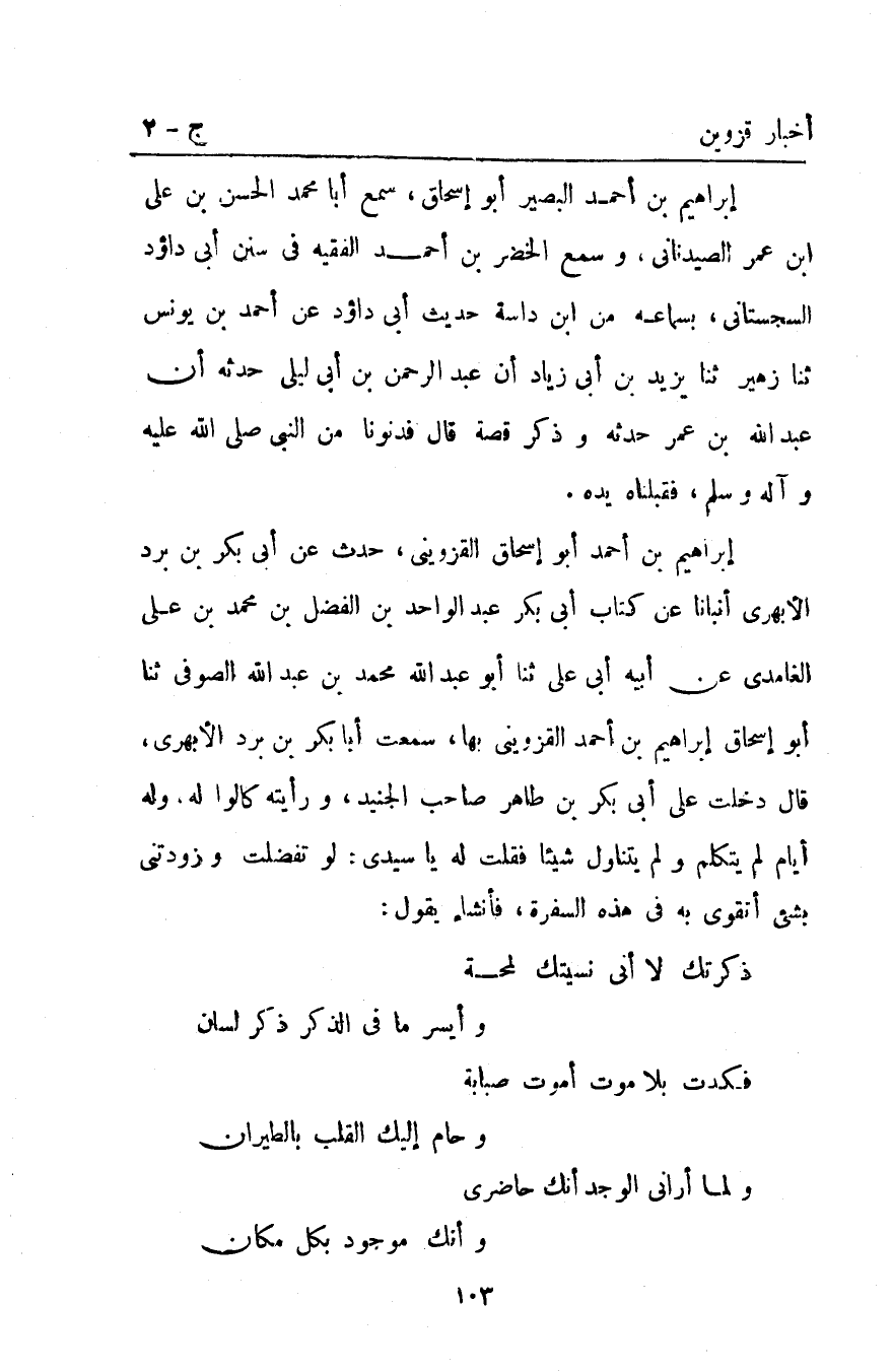 إبراهيم بْن أَحْمَد أَبُو إسحاق الْقَزْوِينِيّ حدث عن أبي بكر بْن برد الأبهري أنبأنا عن كتاب أبي بكر عَبْد الواحد بْن الفضل بْن مُحَمَّد بْن علي الغامدي عن أبيه أبي عَلَى ثنا أبو عَبْد اللَّه مُحَمَّد بْن عَبْدِ اللَّهِ الصوفي ثنا أَبُو إسحاق إبراهيم بْن أَحْمَدَ القزويني بها سمعت أبا بكر بْن برد الأبهري قَالَ دخلت على أبي بكر بْن طاهر صاحب الجنيد ورأيته كالوا له وله أيام لم يتكلم ولم يتناول شيئا فقلت له يا سيدي لو تفضلت وزودتني بشيء أتقوى به فِي هَذِهِ السفرة فأنشاء يقول:
