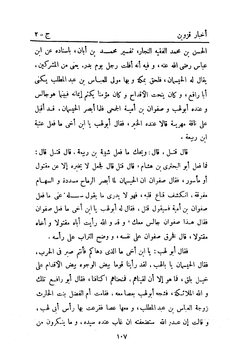 الحسن بْن مُحَمَّد الفقيه النجار تفسير مُحَمَّد بْن أبان بإسناده عَنِ ابْنِ عَبَّاسٍ رَضِيَ اللَّهُ عَنْهُ وفيه أنه أفلت رجل يوم بدر يعني من المشركين يقال له الحيسمان فلحق بمكة وبها مولي للعباس بْن عَبْدِ المطلب يكني أبا رافع وكان ينحت الأقداح وكان مؤمنا يكتم إيمانه فبينما هو جالس وعنده أَبُو لهب وصفوان بْن أمية الجمحي فلما أبصر الحيسمان قد أقبل عَلَى ناقة مهرية قالا عنده الخبر فقال أَبُو لهب يا ابن أخي ما فعل عتبة ابن ربيعة.