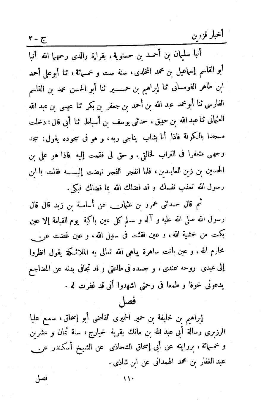 ثُمَّ قَالَ حَدَّثَنِي عَمْرُو بْنُ عُثْمَانَ عَنْ أُسَامَةَ بْنِ زَيْدٍ قَالَ: قَالَ رَسُولُ اللَّهِ صَلَّى الله عليه وآله وَسَلَّمَ: "كُلُّ عَيْنٍ بَاكِيَةٍ يَوْمَ القيامة إلا عين بكت من خشية الله وعين فُقِئَتْ فِي سَبِيلِ اللَّهِ وَعَيْنٌ غضت عن محارم الله وعين بَاتَتْ سَاهِرَةً يُبَاهِي اللَّهُ تَعَالَى بِهِ الْمَلائِكَةَ يَقُولُ انْظُرُوا إِلَى عَبْدِي رُوحُهُ عِنْدِي وَجَسَدُهُ فِي طَاعَتِي وَقَدْ تَجَافَى بَدَنُهُ عَنِ الْمَضَاجِعِ يَدْعُونِي خَوْفًا وَطَمَعًا فِي رَحْمَتِي اشْهَدُوا أَنِّي قَدْ غَفَرْتُ له".