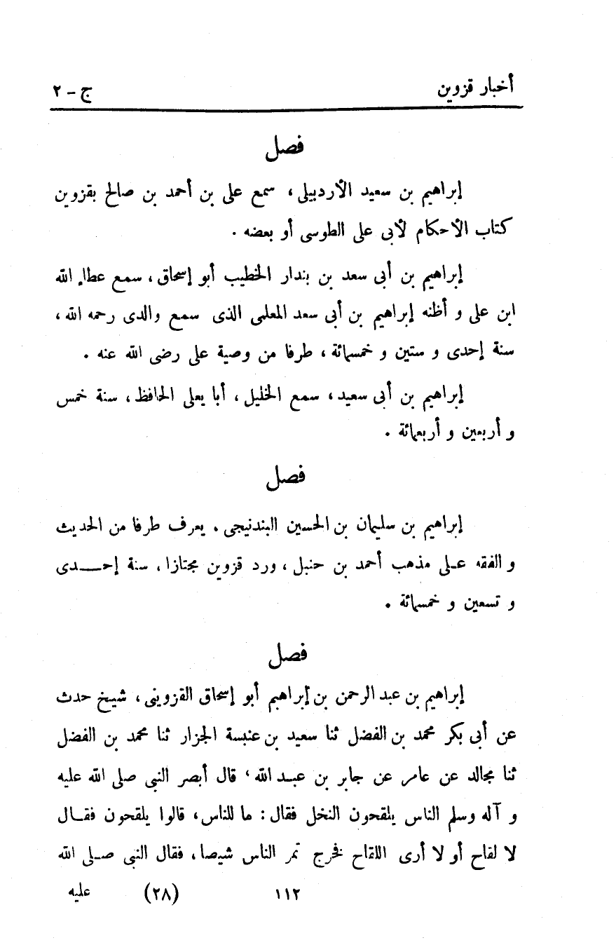 إبراهيم بْنِ عَبْدِ الرَّحْمَنِ بْنِ إبراهيم أَبُو إسحاق الْقَزْوِينِيّ شيخ حدث عَنْ أَبِي بَكْرٍ مُحَمَّدِ بْنِ الْفَضْلِ ثنا سَعِيدُ بْنُ عَنْبَسَةَ الْجَزَّارُ ثنا مُحَمَّدُ بْنُ الْفَضْلِ ثنا مُجَالِدٌ عَنْ عَامِرٍ عَنْ جَابِرِ بْنِ عَبْدِ اللَّهِ قَالَ أَبْصَرَ النَّبِيُّ صَلَّى اللَّهُ عليه وآله وَسَلَّمَ النَّاسَ يُلَقِّحُونَ النَّخْلَ فَقَالَ: "مَا لِلنَّاسِ" قَالُوا يُلَقِّحُونَ فَقَالَ: "لا لِقَاحَ أَوْ لا أَرَى اللِّقَاحَ" فَخَرَجَ تَمْرُ النَّاسِ شِيصًا فقال النبي صلى الله