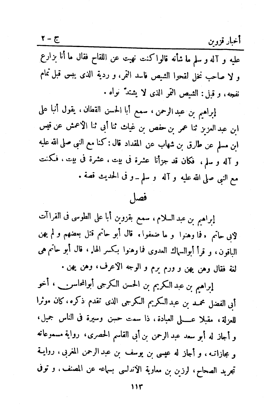 إبراهيم بْن عَبْدِ الرَّحْمَنِ سمع أبا الحسن القطان يقول أَنْبَأَ عَلِيُّ ابن عَبْدِ الْعَزِيزِ ثنا عُمَرُ بْنُ حَفْصِ بْنِ غِيَاثٍ ثنا أَبِي الأعمش عن قيس ابن مُسْلِمٍ عَنْ طَارِقِ بْنِ شِهَابٍ عَنِ الْمِقْدَادِ قَالَ كُنَّا مَعَ النَّبِيَّ صَلَّى اللَّهُ عَلَيْهِ وَآلِهِ وَسَلَّمَ فَكَانَ قَدْ جَزَّأَنَا عَشَرَةً فِي بَيْتٍ عَشَرَةً فِي بَيْتٍ فَكُنْتُ مَعَ النَّبِيِّ صَلَّى اللَّهُ عليه وآله وسلم وفي الحديث قصة.