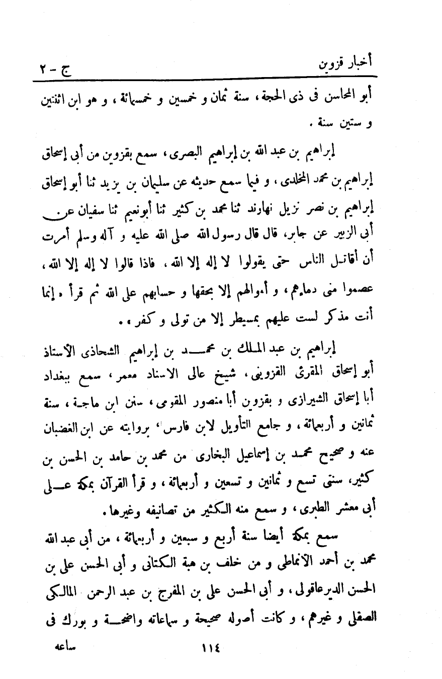 أَبُو المحاسن فِي ذي الحجة سنة ثمان وخمسين وخمسمائة وهو ابن اثنتين وستين سنة. إِبْرَاهِيمَ بْنِ عَبْدِ اللَّهِ بْنِ إبراهيم الْبَصْرِيُّ سَمِعَ بِقَزْوِينَ مِنْ أَبِي إِسْحَاقَ إِبْرَاهِيمَ بْنِ مُحَمَّدِ الْمَخْلَدِيِّ وَفِيمَا سَمِعَ حَدِيثُهُ عَنْ سُلَيْمَانُ بْنُ يَزِيدَ ثَنَا أَبُو إِسْحَاقَ إبراهيم بْنُ نَصْرٍ نَزِيلُ نَهَاوَنْدَ ثنا مُحَمَّدُ بْنُ كَثِيرٍ ثنا أَبُو نُعَيْمٍ ثنا سُفْيَانُ عَنْ أَبِي الزُّبَيْرِ عَنْ جَابِرٍ قَالَ: قَالَ رَسُولُ اللَّهِ صَلَّى الله عليه وآله وَسَلَّمَ: "أُمِرْتُ أَنْ أُقَاتِلَ النَّاسَ حَتَّى يَقُولُوا لا إِلَهَ إِلا اللَّهُ فَإِذَا قَالُوا لا إِلَهَ إِلا اللَّهُ عَصَمُوا مِنِّي دِمَاءَهُمْ وَأَمْوَالَهُمْ إِلا بِحَقِّهَا وَحِسَابُهُمْ عَلَى اللَّهِ" ثُمَّ قَرَأَ: {إِنَّمَا أَنْتَ مُذَكِّرٌ لَسْتَ عَلَيْهِمْ بِمُصَيْطِرٍ إِلَّا مَنْ تَوَلَّى وَكَفَرَ} .
