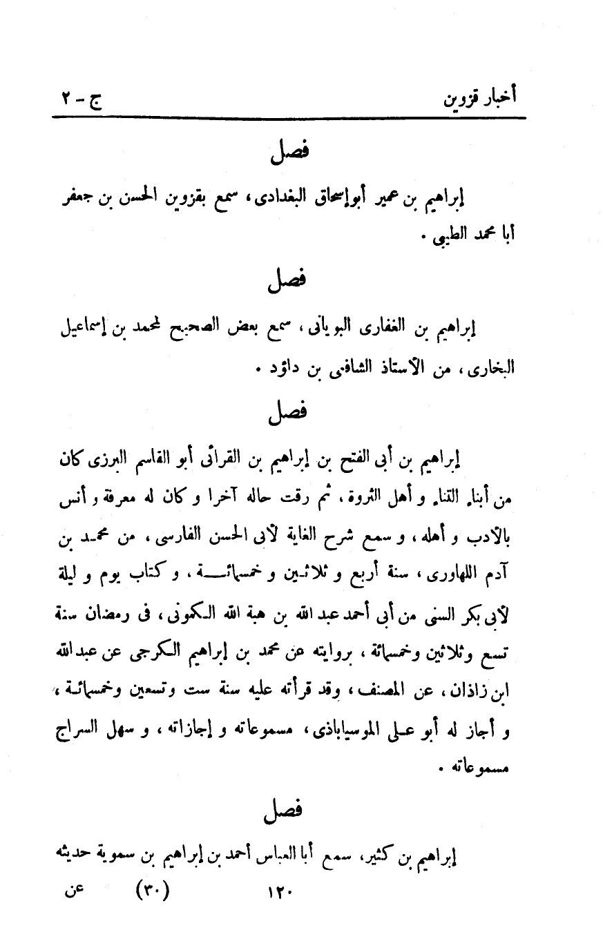 إبراهيم بْن عمير أَبُو إسحاق البغدادي سمع بِقَزْوِينَ الحسن بْن جعفر أبا محمد الطيبي فصل إبراهيم بْن الغفاري البوياني سمع بعض الصَّحِيحُ لِمُحَمَّدِ بْنِ إِسْمَاعِيلَ الْبُخَارِيِّ من الأستاذ الشافعي بن داؤد.