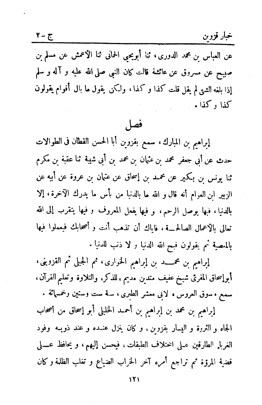 إبراهيم بْن المبارك سمع بِقَزْوِينَ أبا الحسن القطان فِي الطوالات حدث عن أبي جعفر مُحَمَّد بْن عُثْمَانَ بْنِ مُحَمَّدِ بْنِ أَبِي شَيْبَةَ ثنا عُقْبَةُ بْنُ مُكْرَمٍ ثنا يُونُسُ بْنُ بُكَيْرٍ عَنْ مُحَمَّدِ بْنِ إِسْحَاقَ عَنْ عُثْمَانَ بْن عروة عن أبيه عن الزبير ابن الْعَوَّامِ أَنَّهُ قَالَ وَاللَّهِ مَا بِالدُّنْيَا مِنْ بَأْسٍ مَا يُدْرِكَ الآخِرَةَ إِلا بِالدُّنْيَا فِيهَا يُوصَلُ الرَّحِمُ وَفِيهَا يُفْعَلُ الْمَعْرُوفُ وَفِيهَا يُتَقَرَّبُ إِلَى اللَّهِ تَعَالَى بِالأَعْمَالِ الصَّالِحَةِ فَإِيَّاكَ أَنْ تَذْهَبَ أَنْتَ وَأَصْحَابُكَ فَيَعْمَلُوا فِيهَا بِالْمَعْصِيَةِ ثُمَّ يَقُولُونَ قَبَّحَ اللَّهُ الدُّنْيَا وَلا ذنب للدنيا.