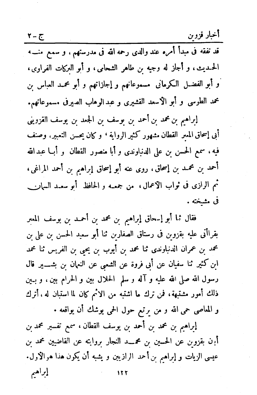 إبراهيم بْنِ مُحَمَّدِ بْنِ أَحْمَدَ بْنِ يوسف القطان سمع تفسير مُحَمَّد بْن أبان بِقَزْوِينَ عن الحسين بْن مُحَمَّد النجار بروايته عن القاضيين مُحَمَّد بْن عِيسَى الزيات وإبراهيم بْن أَحْمَد الرازيين ويشبه أن يكون هذا هو الأول.