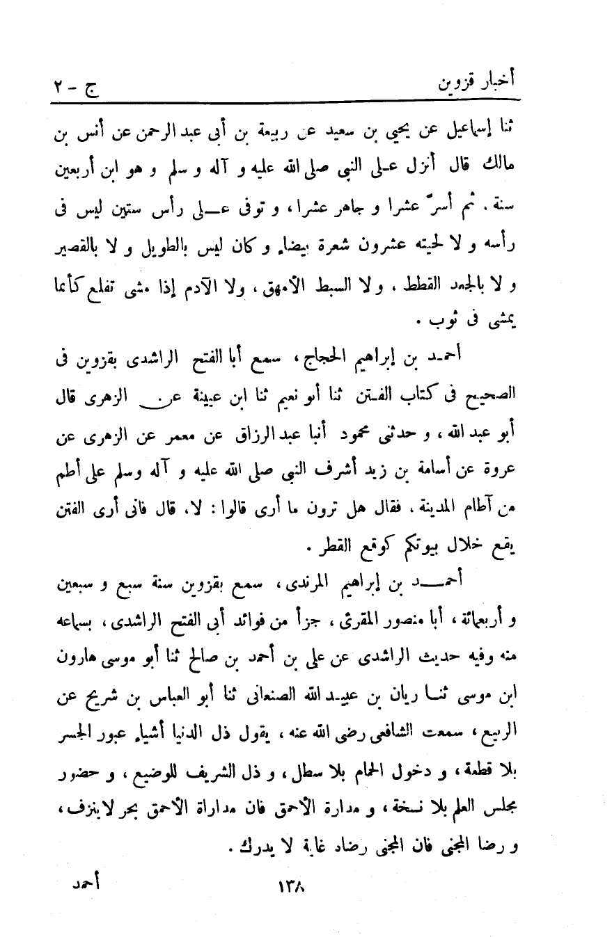 أَحْمَدُ بْنُ إبراهيم الْحَجَّاجُ سمع أبا الفتح الراشذي بِقَزْوِينَ فِي الصَّحِيحِ فِي كِتَابِ الْفِتَنِ ثنا أَبُو نُعَيْمٍ ثنا ابْنُ عُيَيْنَةَ عَنِ الزُّهْرِيِّ قَالَ أَبُو عَبْدِ اللَّهِ وَحَدَّثَنِي مَحْمُودٌ أَنْبَأَ عَبْدُ الرَّزَّاقِ عَنْ مَعْمَرٍ عَنِ الزُّهْرِيِّ عَنْ عُرْوَةَ عَنْ أُسَامَةَ بْنِ زَيْدٍ أَشْرَفَ النَّبِيُّ صَلَّى اللَّهُ عَلَيْهِ وَآلِهِ وَسَلَّمَ عَلَى أُطْمٍ مِنْ آطَامِ الْمَدِينَةِ فَقَالَ هَلْ تَرَوْنَ مَا أَرَى قَالُوا لا قَالَ فَإِنِّي أَرَى الْفِتَنَ يَقَعُ خِلالَ بُيُوتِكُمْ كَوَقْعِ الْقَطْرِ.
