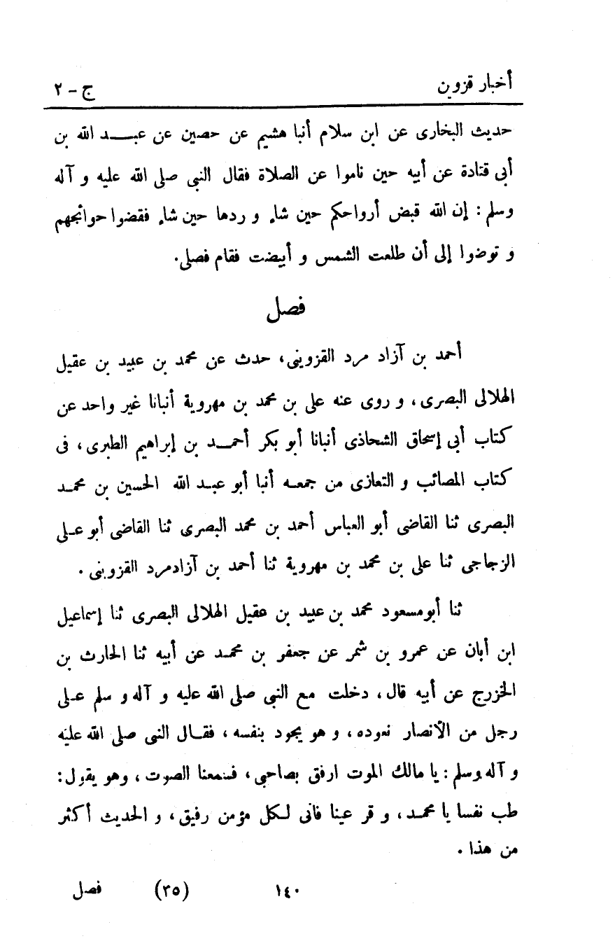 أحمد بن آزاد مرد الْقَزْوِينِيُّ حَدَّثَ عَنْ مُحَمَّدِ بْنِ عُبَيْدِ بْنِ عُقَيْلٍ الْهِلالِيِّ الْبَصْرِيِّ وَرَوَى عَنْهُ عَلِيُّ بْنُ مُحَمَّدِ بْنِ مَهْرَوَيْهِ أَنْبَأَنَا غَيْرُ وَاحِدٍ عَنْ كِتَابِ أَبِي إِسْحَاقَ الشَّحَّاذِيِّ أَنْبَأَنَا أَبُو بَكْرٍ أَحْمَدُ بْنُ إبراهيم الطَّبَرِيُّ فِي كِتَابِ الْمَصَائِبِ وَالتَّعَازِي مِنْ جَمْعِهِ أَنْبَأَ أَبُو عَبْدِ اللَّهِ الْحُسَيْنُ بْنُ مُحَمَّدٍ الْبَصْرِيُّ ثنا الْقَاضِي أَبُو الْعَبَّاسِ أَحْمَدُ بْنُ مُحَمَّدٍ الْبَصْرِيُّ ثنا الْقَاضِي أَبُو عَلِيٍّ الزَّجَّاجِيُّ ثنا عَلِيُّ بْنُ مُحَمَّدِ بْنِ مَهْرَوَيْهِ ثنا أَحْمَدُ بْنُ آزَادمردَ الْقَزْوِينِيُّ.