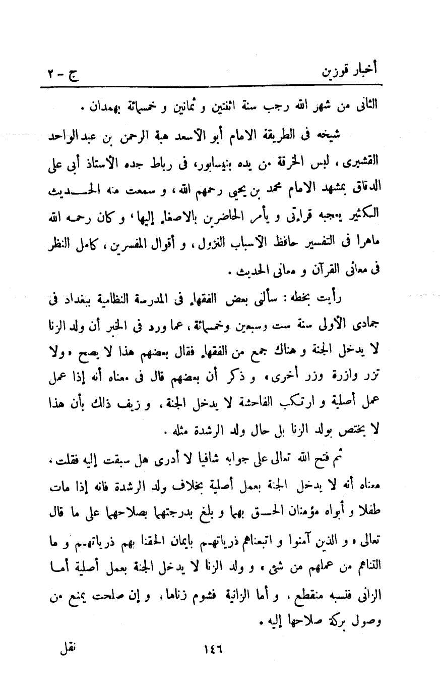رأيت بخطه سألني بعض الفقهاء فِي المدرسة النظامية ببغداد فِي جمادي الأولي سنة ست وسبعين وخمسمائة عما ورد فِي الخبر أن ولد الزنا لا يدخل الجنة وهناك جمع من الفقهاء فقال بعضهم هذا لا يصح وَلا تزر وازرة وزر أخرى وذكر أن بعضهم قَالَ فِي معناه أنه إذا عمل عمل أصلية وارتكب الفاحشة لا يدخل الجنة وزيف ذلك بأن هذا لا يختص بولد الزنا بل حال ولد الرشدة مثله.