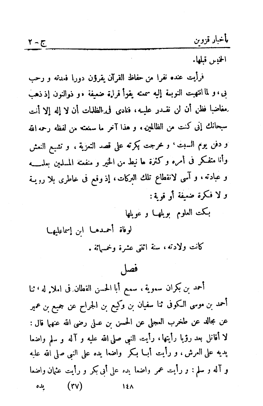 فرأيت عنده نفرا من حفاظ القرآن يقرؤن دورا فعدته ورحب بي ولما انتهيت النوبة إليه سمعته يقرأ قراءة ضعيفة {وَذَا النُّونِ إِذْ ذَهَبَ مُغَاضِباً فَظَنَّ أَنْ لَنْ نَقْدِرَ عَلَيْهِ فَنَادَى فِي الظُّلُمَاتِ أَنْ لا إِلَهَ إِلَّا أَنْتَ سُبْحَانَكَ إِنِّي كُنْتُ مِنَ الظَّالِمِينَ} وهذا آخر ما سمعته من لفظه رحمه اللَّه ودفن يوم السبت وخرجت بكرته عَلَى قصد التعزية وتشيع النعش وأنا متفكر فِي أمره وكثرة ما نيط من الخير ومنفعته للمسلمين بعلمه وعبادته وآسي لانقطاع تلك البركات إذ وقع فِي خاطري بلا روية ولا فكرة ضعيفة أو قوية: