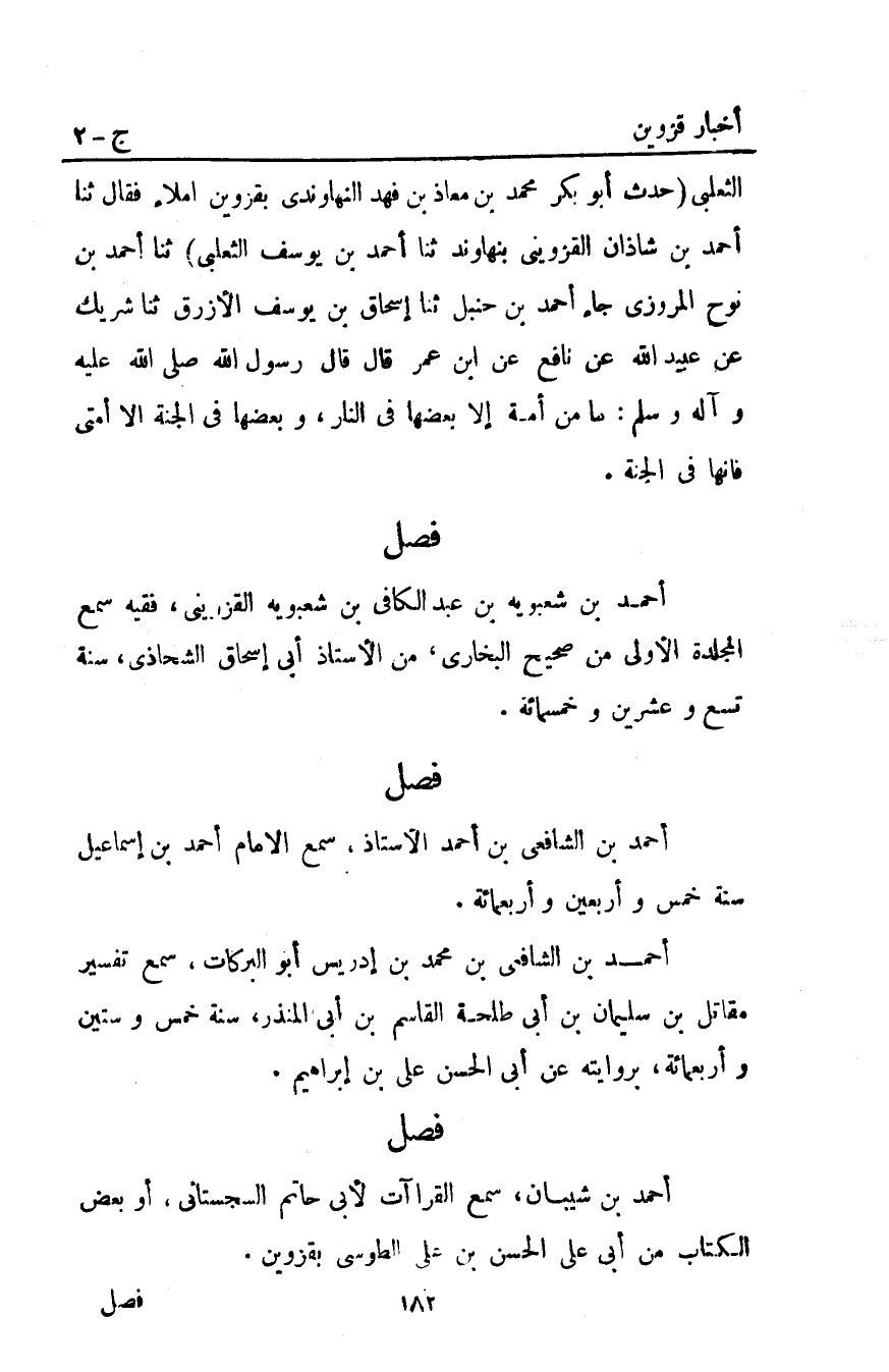 أحمد بْن شعبويه بْن عَبْدِ الكافي بْن شعبويه الْقَزْوِينِيّ فقيه سمع المجلدة الأولي من صحيح البخاري من الأستاذ أبي إسحاق الشحاذي سنة تسع وعشرين وخمسمائة.