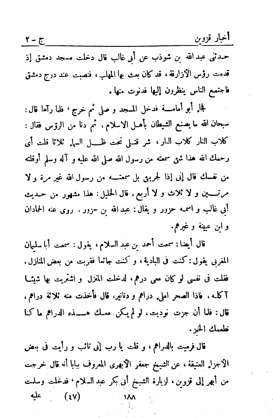 فَجَاءَ أَبُو أُمَامَةَ فَدَخَلَ الْمَسْجِدَ وَصَلَّى ثُمَّ خَرَجَ فَلَمَّا رَآهَا قَالَ سُبْحَانَ اللَّهِ مَا يَصْنَعُ الشَّيْطَانُ بِأَهْلِ الإِسْلامِ ثُمَّ دَنَا مِنَ الرُّؤُسِ فَقَالَ كِلابُ النَّارِ كِلابُ النَّارِ شَرُّ قَتْلَى تَحْتَ ظِلِّ السَّمَاءِ ثَلاثًا قُلْتُ أَيْ رَحِمَكَ اللَّهُ هَذَا شَيْءٌ سَمِعْتُهُ مِنْ رَسُولِ اللَّهِ صَلَّى اللَّهُ عَلَيْهِ وَآلِهِ وَسَلَّمَ أَوْ قُلْتَهُ مِنْ نَفْسِكَ قال إني إذا لجريىء بَلْ سَمِعْتُهُ مِنْ رَسُولِ اللَّهِ غير مرة ولا مرتين ولا ثلاث ولا أربع قَالَ الخليل هذا مشهور من حديث أبي غالب واسمه حزور ويقال عَبْد اللَّهِ بْن حزور روى عَنْهُ الحمادان وابن عيينة وغيرهم.