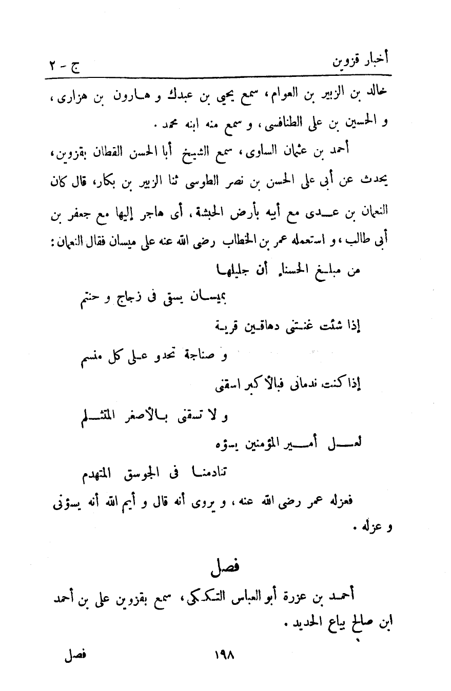 أَحْمَد بْن عثمان الساوي سَمِعَ الشَّيْخَ أَبَا الْحَسَنِ الْقَطَّانَ بِقَزْوِينَ يُحَدِّثُ عَنْ أَبِي عَلَيٍّ الْحَسَنُ بْنُ نَصْرٍ الطُّوسِيِّ ثنا الزُّبَيْرُ بْنُ بَكَّارٍ قَالَ كَانَ النُّعْمَانُ بْنُ عَدِيٍّ مَعَ أَبِيهِ بِأَرْضِ الْحَبَشَةِ أَيْ هَاجَرَ إِلَيْهَا مَعَ جَعْفَرِ بْنِ أَبِي طَالِبٍ وَاسْتَعْمَلَهُ عمر بْن الخطاب رضي اللَّه عَنْهُ عَلَى مَيْسَانَ فَقَالَ النُّعْمَانُ: