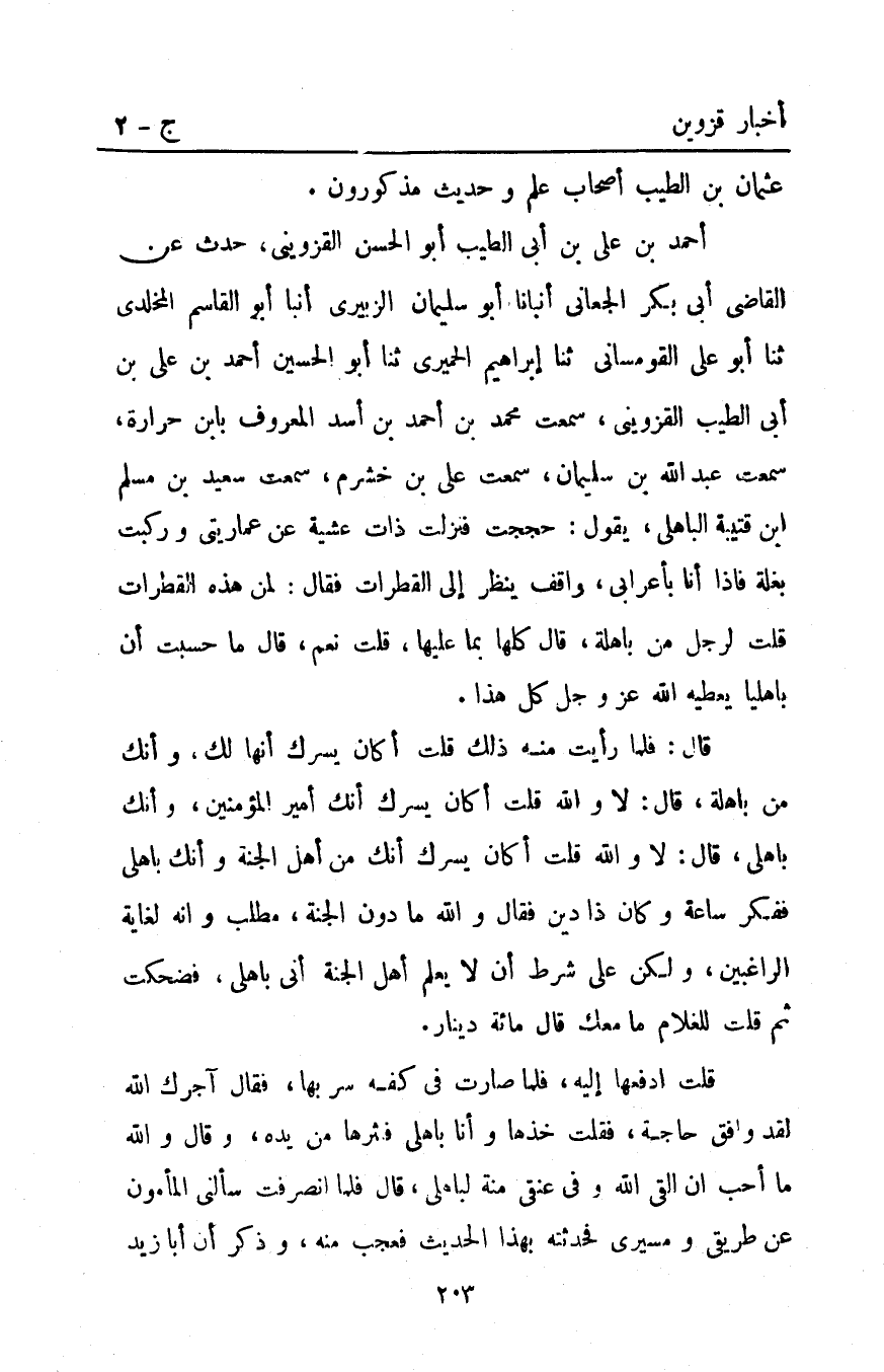 أَحْمَد بْن علي بْن أبي الطيب أَبُو الحسن الْقَزْوِينِيّ حدث عن القاضي أبي بكرالجعاني أنبأنا أَبُو سليمان الزبيري أنبأ أَبُو القاسم المخلدي ثنا أَبُو عَلَى القومساني ثنا إبراهيم الحميري ثَنَا أَبُو الْحُسَيْنِ أَحْمَدُ بْنُ علي بْن أبي الطيب الْقَزْوِينِيّ سمعت مُحَمَّد بْن أَحْمَد بْن أسد المعروف بابن حرارة سمعت عَبْد اللَّهِ بْن سليمان سمعت علي بْن خشرم سمعت سعيد بن مسلم ابن قتيبة الباهلي يقول حججت فنزلت ذات عشية عن عماريتي وركبت بغلة فإذا انا بأعرابي واقف ينظر إِلَى القطرات فقال لمن هَذِهِ القطرات قلت لرجل من باهلة قَالَ كلها بما عليها قلت نعم قَالَ ما حسبت ان باهليا يعطيه اللَّه عز وجل كل هذا.