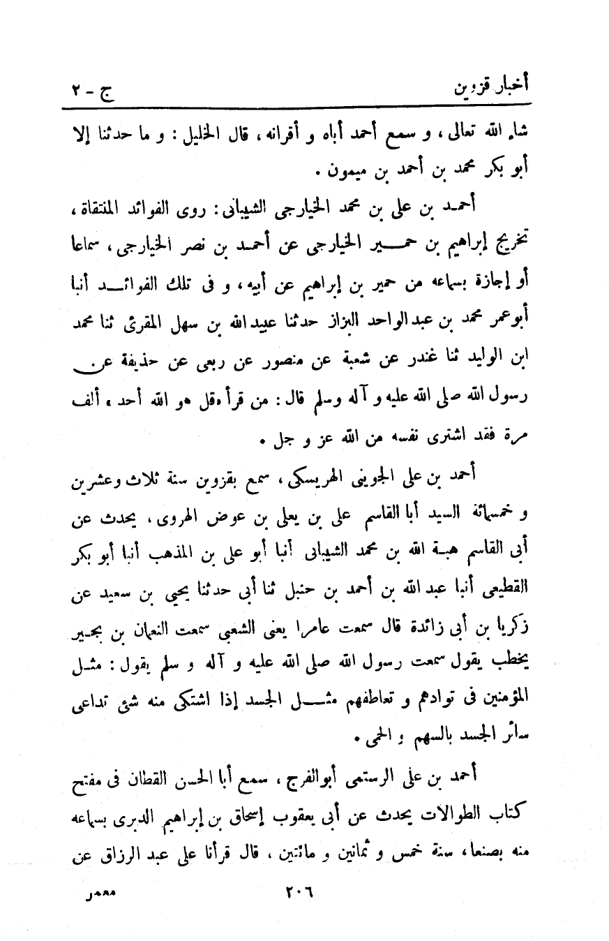 أَحْمَدُ بْنُ عَلِيٍّ الْجُوَيْنِيُّ الْهَرِيسَكِيُّ سَمِعَ بِقَزْوِينَ سَنَةَ ثَلاثٍ وَعِشْرِينَ وخمسمائة السَّيِّدَ أَبَا الْقَاسِمِ عَلِيَّ بْنَ يَعْلَى بْنِ عَوَضٍ الْهَرَوِيَّ يُحَدِّثُ عَنْ أَبِي الْقَاسِمِ هِبَةِ اللَّهِ بْنِ مُحَمَّدٍ الشَّيْبَانِيِّ أَنْبَأَ أَبُو عَلِيِّ بْنُ الْمُذْهِبِ أَنْبَأَ أَبُو بَكْرٍ الْقَطِيعِيُّ أَنْبَأَ عَبْدُ اللَّهِ بْنُ أَحْمَدَ بْنِ حَنْبَلٍ ثنا أَبِي حَدَّثَنَا يَحْيَى بْنُ سَعِيدٍ عَنْ زَكَرِيَّا بْنِ أَبِي زَائِدَةَ قَالَ سَمِعْتُ عَامِرًا يَعْنِي الشَّعْبِيَّ سمعت النعمان بن بجير يَخْطُبُ يَقُولُ سَمِعْتُ رَسُولَ اللَّهِ صَلَّى اللَّهُ عَلَيْهِ وَآلِهِ وَسَلَّمَ يَقُولُ" "مَثَلُ الْمُؤْمِنِينَ فِي تَوَادِّهِمْ وَتَعَاطُفِهِمْ مَثَلُ الْجَسَدِ الْوَاحِدِ إِذَا اشْتَكَى مِنْهُ شَيْءٌ تَدَاعَى سَائِرُ الْجَسَدِ بِالسَّهَرِ وَالْحُمَّى".