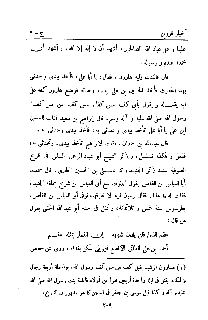 قَالَ فَالْتَفَتَ إِلَيْهِ هَارُونُ فقال با أَبَا عَلِيٍّ فَأَخَذَ بِيَدِي وَحَدَّثَنِي بِهَذَا الْحَدِيثِ فَأَخَذَ الْحُسَيْنُ بْنُ عَلِيٍّ بِيَدِهِ وَحَدَّثَهُ فَوَضَعَ هَارُونُ كَفَّهُ عَلَى فِيهِ يُقَبِّلُهُ وَيَقُولُ بِأَبِي كَفٌّ مَسَّ كَفًّا مَسَّ كَفَّ مَنْ مَسَّ كَفَّ1 رَسُولِ اللَّهِ صَلَّى اللَّهُ عَلَيْهِ وَآلِهِ وَسَلَّمَ قَالَ إبراهيم بْنُ سَعِيدٍ فقلت للحسين ابن عَلِيٍّ يَا أَبَا عَلِيٍّ تَأْخُذُ بِيَدِي وَتُحَدِّثُنِي بِهِ فَأَخَذَ بِيَدِي وَحَدَّثَنِي بِهِ.