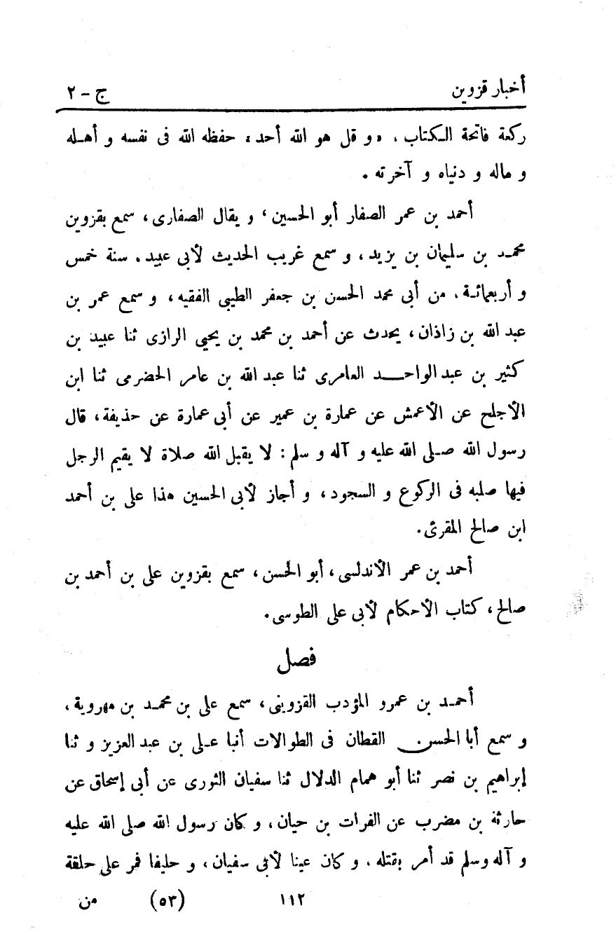 رَكْعَةٍ فَاتِحَةَ الْكِتَابِ وَ {قُلْ هُوَ اللَّهُ أَحَدٌ} حَفِظَهُ اللَّهُ فِي نَفْسِهِ وَأَهْلِهِ وَمَالِهِ وَدُنْيَاهُ وَآخِرَتِهِ أَحْمَدُ بْنُ عُمَرَ الصَّفَّارُ أَبُو الْحُسَيْنِ وَيُقَالُ الصَّفَّارِيُّ سَمِعَ بِقَزْوِينَ مُحَمَّدَ بْنَ سُلَيْمَانَ بْنِ يَزِيدَ وَسَمِعَ غَرِيبَ الْحَدِيثِ لأَبِي عبيد سنة خمس وأربعمائة من أبي مُحَمَّد الحسن بْن جَعْفَرٍ الطَّيْبِيِّ الْفَقِيهِ وَسَمِعَ عُمَرَ بْنُ عَبْدِ اللَّهِ بْنِ زَاذَانَ يُحَدِّثُ عَنْ أَحْمَدَ بْنِ مُحَمَّدِ بْنِ يَحْيَى الرَّازِيِّ ثنا عُبَيْدُ بْنُ كَثِيرِ بْنِ عَبْدِ الْوَاحِدِ الْعَامِرِيُّ ثنا عَبْدُ اللَّهِ بْنُ عَامِرٍ الْحَضْرَمِيُّ ثنا ابْنُ الأَجْلَحِ عَنِ الأَعْمَشِ عَنْ عُمَارَةَ بْنِ عُمَيْرٍ عَنْ أَبِي عُمَارَةَ عَنْ حُذَيْفَةَ قَالَ رَسُولُ اللَّهِ صَلَّى اللَّهُ عَلَيْهِ وَآلِهِ وَسَلَّمَ: "لا يَقْبَلُ اللَّهُ صَلاةً لا يُقِيمُ الرَّجُلُ فِيهَا صُلْبَهُ فِي الرُّكُوعِ وَالسُّجُودِ" وَأَجَازَ لأَبِي الْحُسَيْنِ هَذَا علي بن أحمد ابن صالح المقرىء.