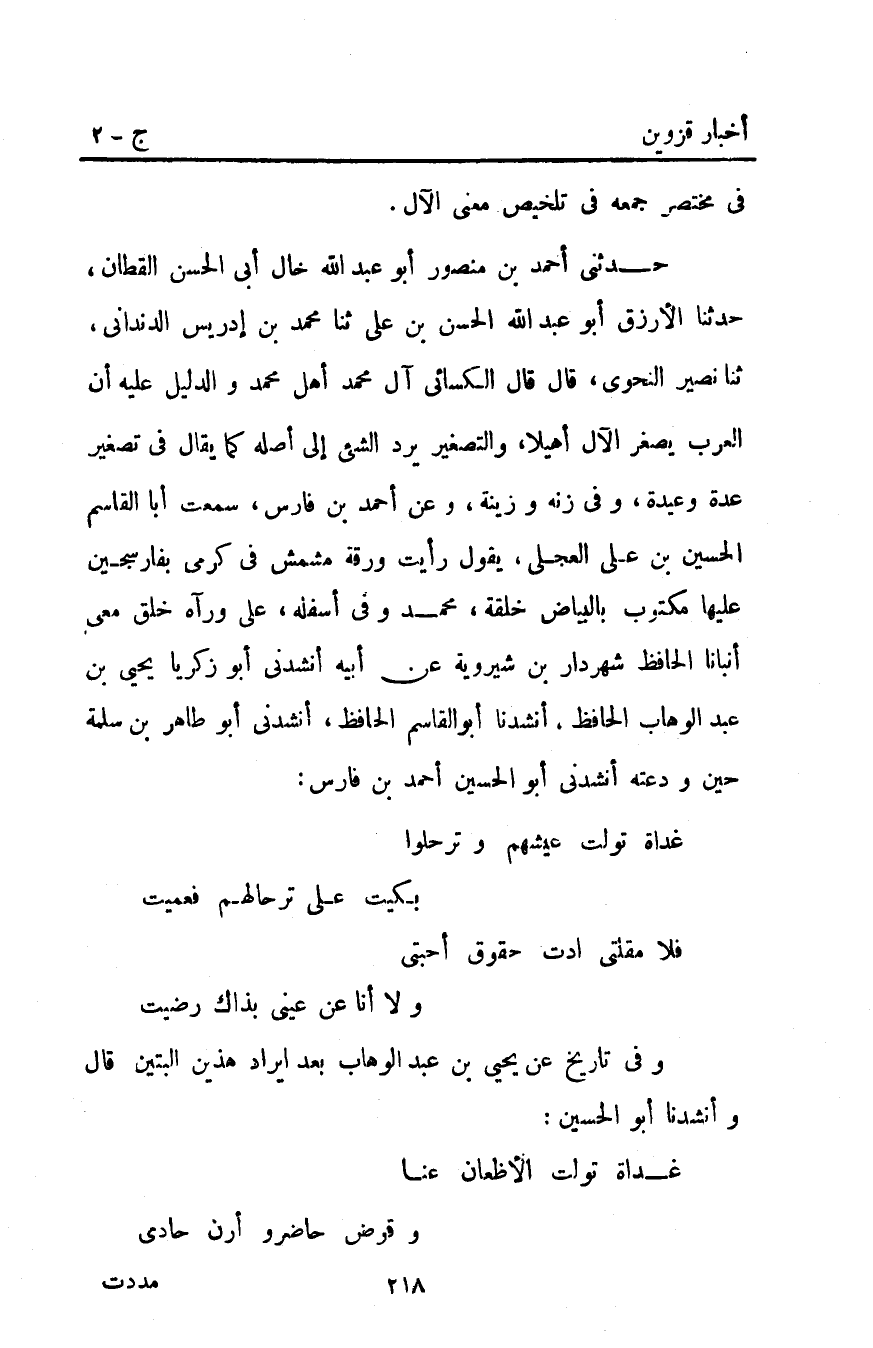 حدثني أَحْمَد بْن منصور أَبُو عَبْد اللَّهِ خال أبي الحسن القطان حدثنا الأرزق أَبُو عَبْد اللَّهِ الحسن بْن علي ثنا مُحَمَّد بْن إدريس الدنداني ثنا نصير النحوي قَالَ قَالَ الكسائي آل مُحَمَّد أهل مُحَمَّد والدليل عليه أن العرب يصغر الآل أهيلا والتصغير يرد الشيء إِلَى أصله كما يقال فِي تصغير عدة وعيدة وفي زنه وزينة وعن أَحْمَد بْن فارس سمعت أبا القاسم الحسين بْن علي العجلي يقول رأيت ورقة مشمش فِي كرمي بفارسجين عليها مكتوب بالبياض خلقة مُحَمَّد وفي أسفله عَلَى ورآه خلق معي أنبأنا الحافظ شهردار بْن شيرويه عن أبيه أنشدني أَبُو زَكَرِيَّا يَحْيَى بْن عَبْدِ الوهاب الحافظ أنشدنا أَبُو القاسم الحافظ أنشدني أَبُو طاهر بْن سلمة حين ودعته أنشدني أَبُو الحسين أَحْمَد بْن فارس: