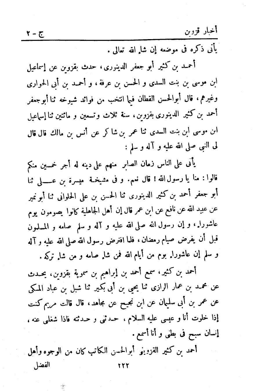أَحْمَد بْن كثير أَبُو جعفر الدَّيْنَوَرِيّ حدث بقزوين عن إسماعيل ابن مُوسَى بْن بنت السدي والحسن بْن عرفة وأحمد بْن أبي الحواري وغيرهم قَالَ أَبُو الْحَسَنِ الْقَطَّانُ فِيمَا انْتَخَبَ مِنْ فَوَائِدِ شُيُوخِهِ ثنا أَبُو جَعْفَرٍ أَحْمَد بْنُ كَثِيرٍ الدَّيْنَوَرِيُّ بِقَزْوِينَ سَنَةَ ثَلاثٍ وَتِسْعِينَ وَمِائَتَيْنِ ثنا إِسْمَاعِيلُ ابن مُوسَى ابْنِ بِنْتِ السُّدِّيِّ ثنا عُمَرُ بْنُ شَاكِرٍ عَنْ أَنَسِ بْنِ مَالِكٍ قَالَ: قَالَ لِي النَّبِيَّ صَلَّى اللَّهُ عَلَيْهِ وَآلِهِ وَسَلَّمَ: