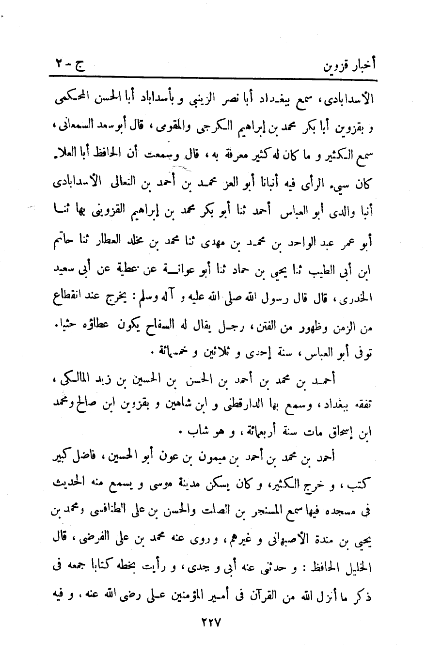 الأسدابادى سمع ببغداد أبا نصر الزينبي وبأسداباد أبا الحسن المحكمي وبقزوين أبا بكر محمد بن إبرهيم الكرجي والمقومي قَالَ أَبُو سعد السمعاني سمع الكثير وماكان له كثير معرفة به قَالَ وسمعت أن الحافظ أبا العلاء كَانَ سيء الرأي فيه أَنْبَأَنَا أَبُو الْعِزِّ مُحَمَّدُ بْنُ أَحْمَد بْنِ النِّعَالِيِّ الأسدابادي أَنْبَأَ وَالِدِي أَبُو الْعَبَّاسِ أَحْمَد ثَنَا أَبُو بَكْرٍ مُحَمَّدُ بْنُ إبراهيم الْقَزْوِينِيُّ بِهَا ثنا أَبُو عمر عبد الواحد بْنُ مُحَمَّدِ بْنِ مَهْدِيٍّ ثنا مُحَمَّدُ بْنُ مَخْلَدٍ الْعَطَّارُ ثنا حاتم ابن أَبِي الطَّيِّبِ ثنا يَحْيَى بْنُ حَمَّادٍ ثنا أَبُو عَوَانَةَ عَنْ عَطِيَّةَ عَنْ أَبِي سَعِيدٍ الْخُدْرِيِّ قَالَ: قَالَ رَسُولُ اللَّهِ صَلَّى اللَّهُ عَلَيْهِ وَآلِهِ وَسَلَّمَ: "يَخْرُجُ عِنْدَ انْقِطَاعٍ مِنَ الزَّمَنِ وَظُهُورٍ مِنَ الْفِتَنِ رَجُلٌ يُقَالُ لَهُ السَّفَّاحُ يَكُونُ عَطَاؤُهُ حَثْيًا".