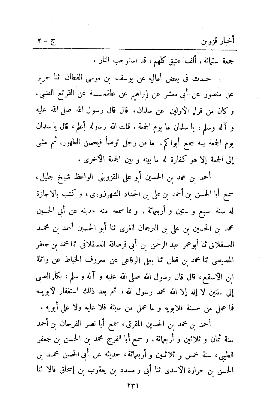 أَحْمَد بْنُ مُحَمَّدِ بْنِ الْحُسَيْنِ أَبُو عَلِيٍّ الْقَزْوِينِيُّ الْوَاعِظُ شَيْخٌ جَلِيلٌ سَمِعَ أَبَا الْحَسَنِ بْنَ أَحْمَد بْنَ عَلِيِّ بْنِ الْحَدَّادِ الشَّهْرُزُورِيَّ وَكَتَبَ بِالإِجَازَةِ لَهُ سَنَةَ سَبْعٍ وَسِتِّينَ وأربعمائة وَمِمَّا سَمِعَهُ مِنْهُ حَدِيثَهُ عَنْ أَبِي الْحُسَيْنِ مُحَمَّدِ بْنِ الْحُسَيْنِ بْنِ عَلِيِّ بْنِ التَّرْجُمَانِ الْغزيِّ ثَنَا أَبُو الْحُسَيْنِ أَحْمَدُ بْنُ مُحَمَّدٍ الْعَسْقَلانِيُّ ثنا أَبُو عُمَرَ عَبْدُ الرَّحْمَنِ بْنُ أَبِي قِرْصَافَةَ الْعَسْقَلانِيُّ ثنا مُحَمَّدُ بْنُ جَعْفَرٍ الْمِصِّيصِيُّ ثنا مُحَمَّدُ بْنُ قَطَنٍ ثنا يَعْلَى الرِّفَاعِيُّ عَنْ مَعْرُوفٍ الخياط عن واثلة ابن الأَسْقَعِ قَالَ: قَالَ رَسُولُ اللَّهِ صَلَّى اللَّهُ عَلَيْهِ وَآلِهِ وَسَلَّمَ: "بُكَاءُ الصَّبِيِّ إِلَى سَنَتَيْنِ لا إِلَهَ إِلا اللَّهُ مُحَمَّدٌ رَسُولُ اللَّهِ ثُمَّ بَعْدَ ذَلِكَ اسْتِغْفَارٌ لأَبَوَيْهِ فَمَا عَمِلَ مِنْ حَسَنَةٍ فَلأَبَوَيْهِ وَمَا عَمِلَ مِنْ سَيِّئَةٍ فَلا عَلَيْهِ وَلا عَلَى أَبَوَيْهِ".