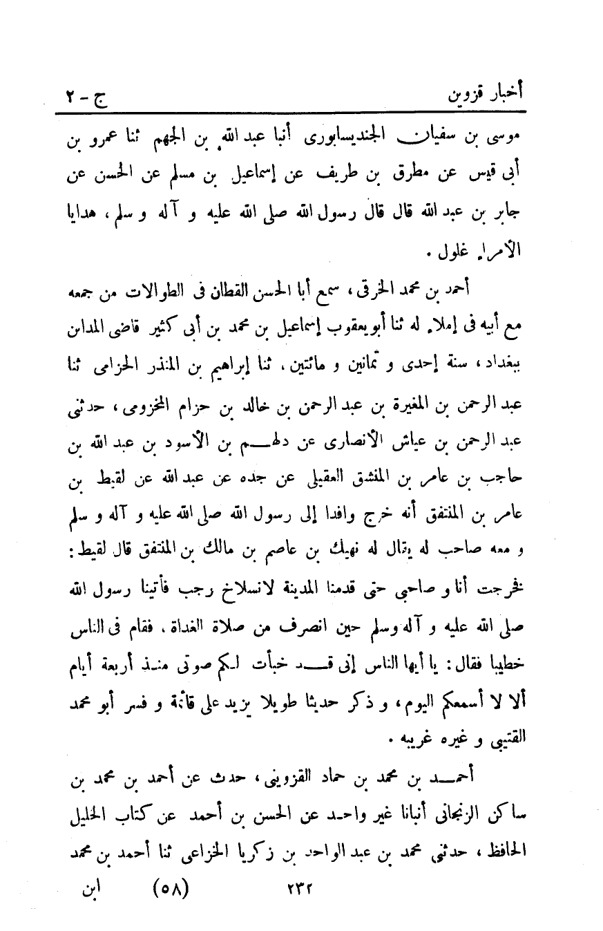 أَحْمَد بْن مُحَمَّد بْن حماد الْقَزْوِينِيّ حدث عن أَحْمَد بْن محمد بن ساكن الزنجاني أنبأنا غَيْرُ وَاحِدٍ عَنِ الْحَسَنِ بْنِ أَحْمَد عن كتاب الخليل الحافظ حَدَّثَنِي مُحَمَّدُ بْنُ عَبْدِ الْوَاحِدِ بْن زَكَرِيَّا الخزاعي ثنا أَحْمَد بن محمد