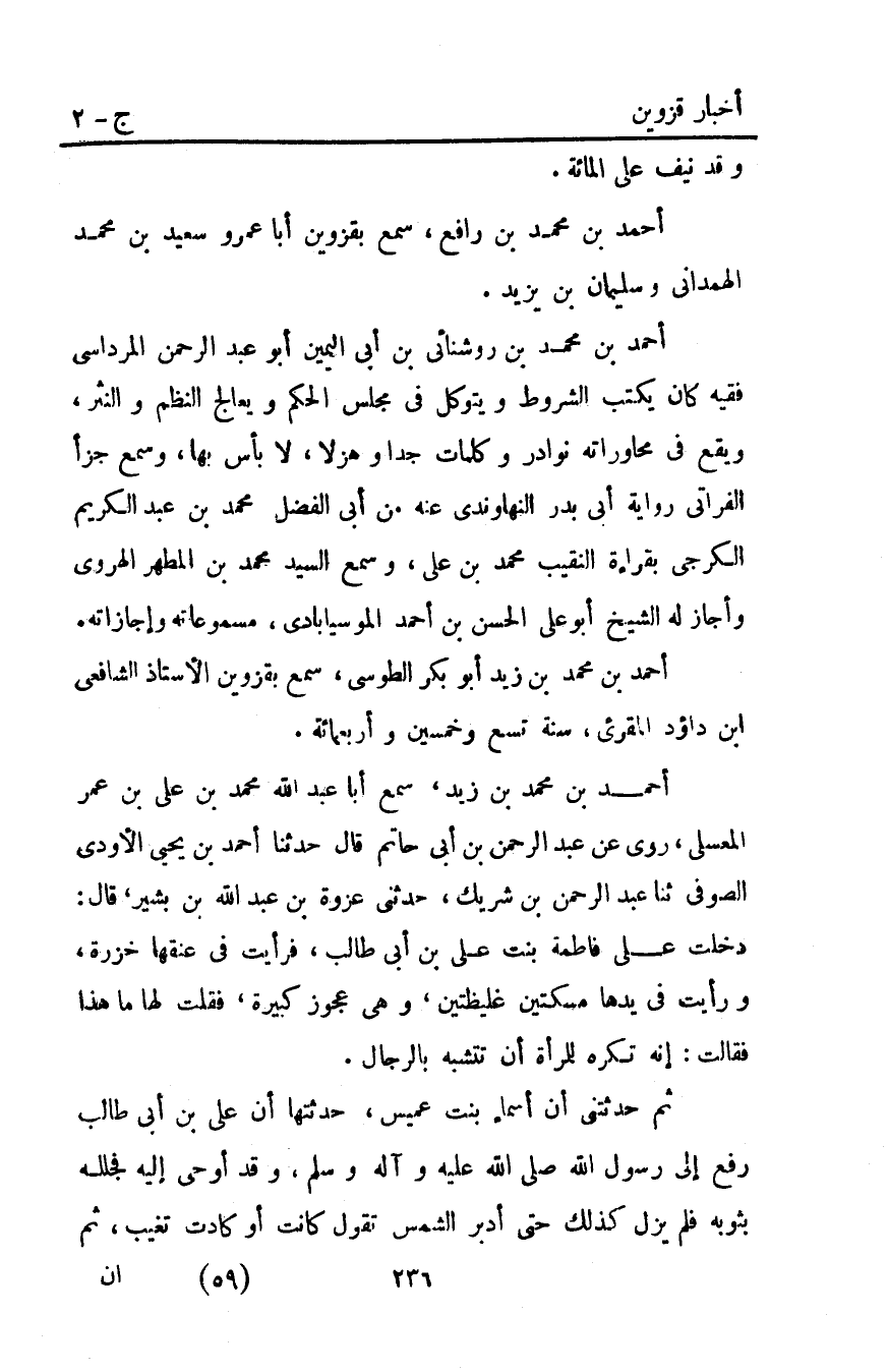 أَحْمَد بْن مُحَمَّد بْن زيد سمع أبا عَبْد اللَّه مُحَمَّد بْن علي بْن عمر المعسلي رُوِيَ عَنْ عَبْدِ الرَّحْمَنِ بْنِ أبي حاتم قَالَ حدثنا أَحْمَد بْن يَحْيَى الأودي الصوفي ثنا عَبْد الرَّحْمَنِ بْن شريك حدثني عزوة بْن عَبْدِ اللَّهِ بْن بشير قَالَ دخلت عَلَى فاطمة بنت علي بْن أبي طالب فرأيت فِي عنقها خرزة ورأيت فِي يدها مسكتين غليظتين وهي عجوز كبيرة فقلت لها ما هذا فقالت إنه تكره للمرأه أن تتشبه بالرجال.