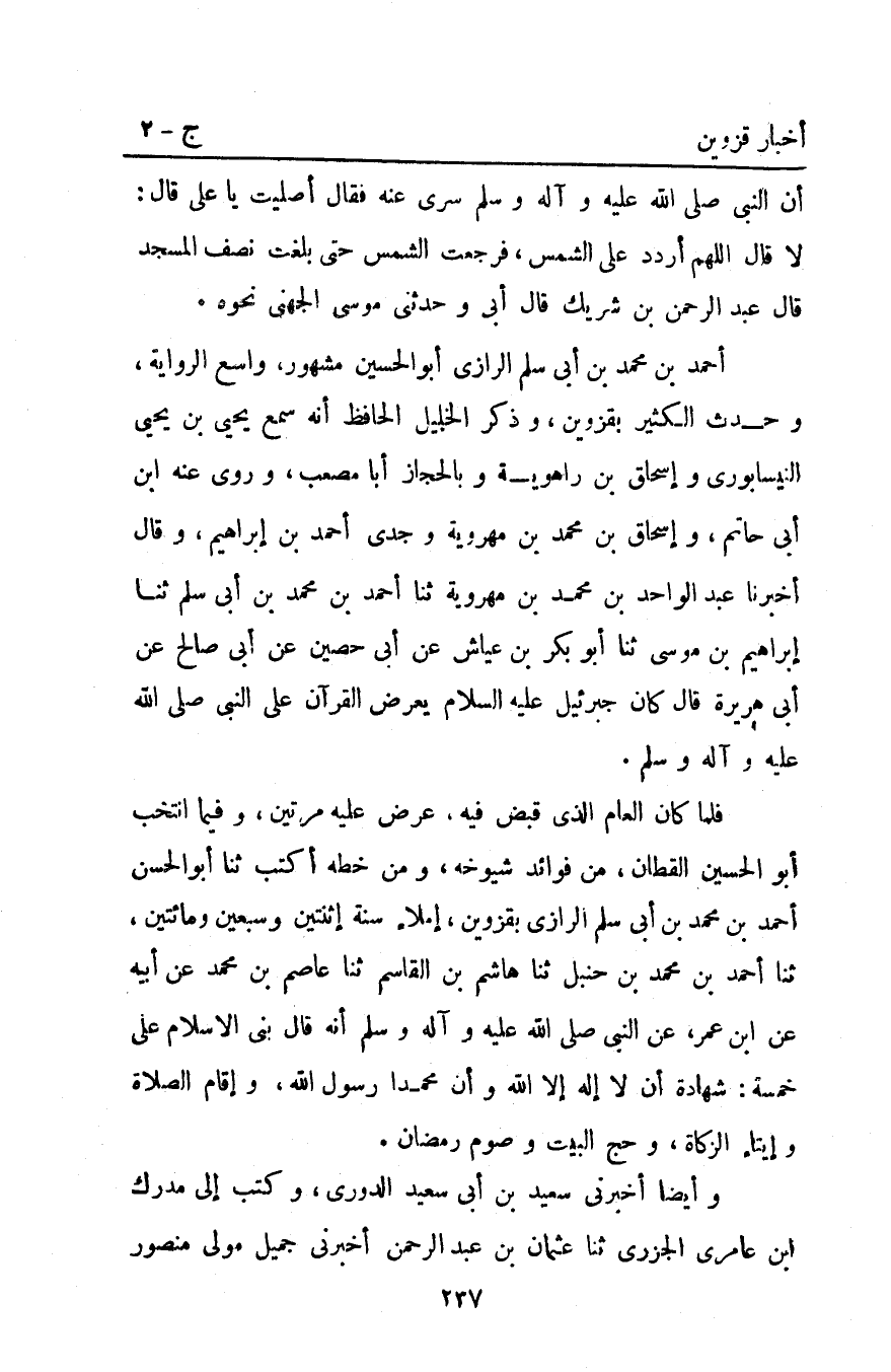 فَلَمَّا كَانَ الْعَامُ الَّذِي قُبِضَ فِيهِ عَرَضَ عَلَيْهِ مَرَّتَيْنِ وفيما انتخب أَبُو الحسين القطان من فوائد شيوخه ومن خطه أكتب ثنا أَبُو الْحَسَنِ أَحْمَد بْنُ مُحَمَّدِ بْنِ أَبِي سَلْمٍ الرَّازِيُّ بِقَزْوِينَ إِمْلاءً سَنَةَ اثْنَتَيْنِ وَسَبْعِينَ وَمِائَتَيْنِ ثنا أَحْمَد بْنُ مُحَمَّدِ بْنِ حَنْبَلٍ ثنا هَاشِمُ بْنُ الْقَاسِمِ ثنا عَاصِمُ بْنُ مُحَمَّدٍ عَنْ أَبِيهِ عَنِ ابْنِ عُمَرَ عَنِ النَّبِيِّ صَلَّى اللَّهُ عَلَيْهِ وَآلِهِ وَسَلَّمَ أَنَّهُ قَالَ: "بُنِيَ الإِسْلامُ عَلَى خَمْسٍ شَهَادَةُ أَنْ لا إِلَهَ إِلا اللَّهُ وَأَنَّ مُحَمَّدًا رَسُولُ اللَّهِ وَإِقَامُ الصَّلاةِ وَإِيتَاءُ الزَّكَاةِ وَحَجُّ الْبَيْتِ وَصَوْمُ رَمَضَانَ".