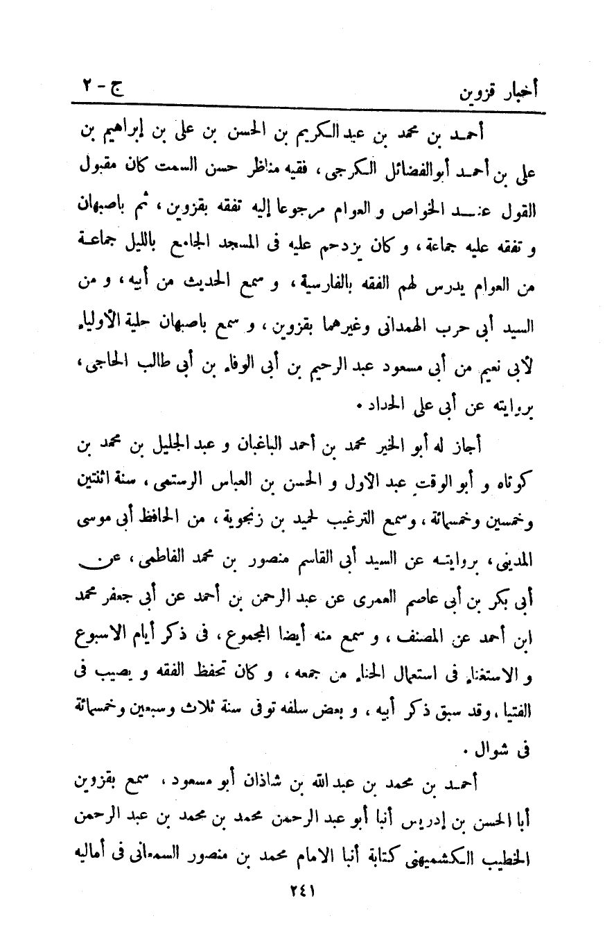 أَحْمَدَ بْن مُحَمَّد بْن عَبْد الكريم بْن الحسن بْن علي بْن إبراهيم بْن علي بْن أَحْمَد أَبُو الفضائل الكرجي فقيه مناظر حسن السمت كَانَ مقبول القول عند الخواص والعوام مرجوعا إليه تفقه بِقَزْوِينَ ثم بأصبهان وتفقه عليه جماعة وكان يزدحم عليه فِي المسجد الجامع بالليل جماعة من العوام يدرس لهم الفقه بالفارسية وسمع الحديث من أبيه ومن السيد أبي حرب الهمداني وغيرهما بِقَزْوِينَ وسمع بأصبهان حلية الأولياء لأبي نعيم من أبي مسعود عَبْد الرحيم بْن أبي الوفاء بْن أبي طالب الحاجي بروايته عن أبي عَلَى الحداد.