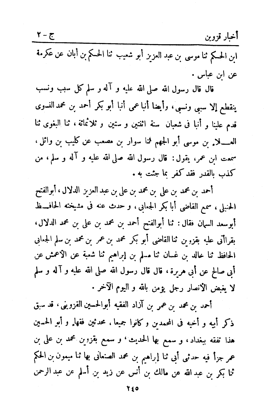 ابن الْحَكَمِ ثنا مُوسَى بْنُ عَبْدِ الْعَزِيزِ أَبُو شُعَيْبٍ ثنا الْحَكَمُ بْنُ أَبَانٍ عَنْ عِكْرِمَةَ عَنِ ابْنِ عَبَّاسٍ. قَالَ: قَالَ رَسُولُ اللَّهِ صَلَّى اللَّهُ عَلَيْهِ وَآلِهِ وَسَلَّمَ: "كُلُّ سَبَبٍ وَنَسَبٍ يَنْقَطِعُ إِلا سَبَبِي وَنَسَبِي" وَأَيْضًا أَنْبَأَ عمي أنبأ أبوبكر أَحْمَد بْنُ مُحَمَّدٍ النَّسَوِيُّ قَدِمَ عَلَيْنَا وَأَنْبَأَ فِي شَعْبَانَ سَنَةَ اثنتين وستين وثلاثمائة ثنا الْبَغَوِيُّ ثنا الْعَلاءُ بْنُ مُوسَى أَبُو الْجَهْمِ ثنا سَوَّارُ بْنُ مُصْعَبٍ عَنْ كُلَيْبِ بْنِ وَائِلٍ سَمِعْتُ ابْنَ عُمَرَ يَقُولُ: قَالَ رَسُولُ اللَّهِ صَلَّى اللَّهُ عليه وآله وَسَلَّمَ: "مَنْ كَذَّبَ بِالْقَدَرِ فَقَدْ كَفَرَ بِمَا جِئْتُ بِهِ".