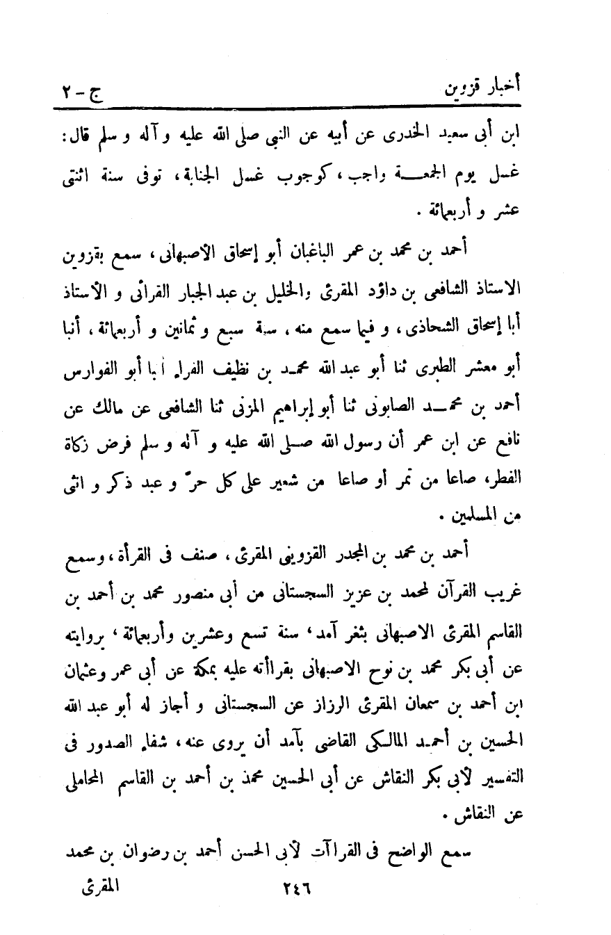 ابن أَبِي سَعِيدٍ الْخُدْرِيِّ عَنْ أَبِيهِ عَنِ النَّبِيِّ صَلَّى اللَّهُ عَلَيْهِ وآله وَسَلَّمَ قَالَ غُسْلُ يَوْمِ الْجُمُعَةِ وَاجِبٌ كَوُجُوبِ غُسْلِ الْجَنَابَةِ توفي سنة اثنتي عشر وأربعمائة.