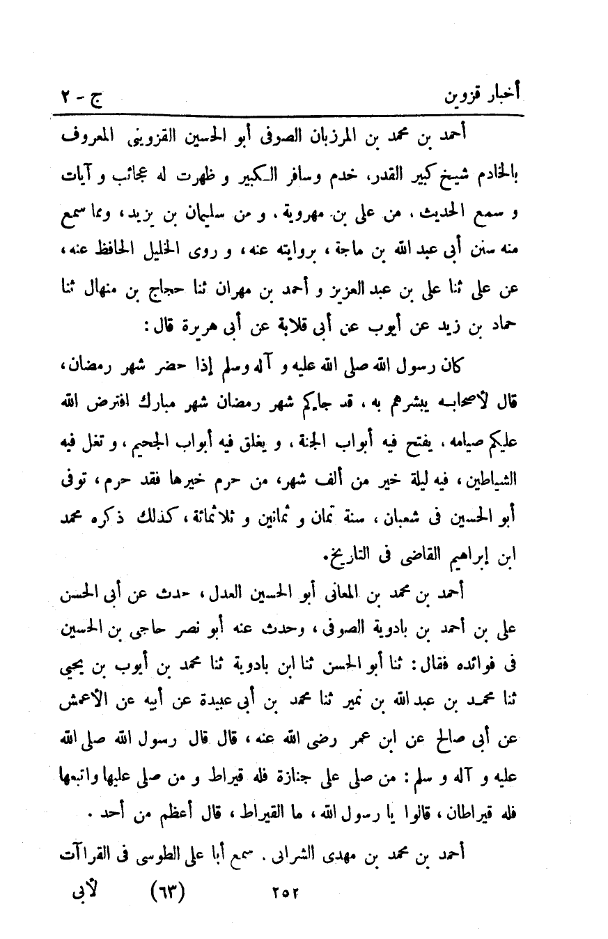 كَانَ رَسُولُ اللَّهِ صَلَّى اللَّهُ عَلَيْهِ وَآلِهِ وَسَلَّمَ إِذَا حَضَرَ شَهْرُ رَمَضَانَ قَالَ لأَصْحَابِهِ يُبَشِّرُهُمْ بِهِ "قَدْ جاءكم شهررمضان شهر مبارك افترض الله علكيم صِيَامَهُ يُفْتَحُ فِيهِ أَبْوَابُ الْجَنَّةِ وَيُغْلَقُ فِيهِ أَبْوَابُ الْجَحِيمِ وَتُغَلُّ فِيهِ الشَّيَاطِينُ فِيهِ لَيْلَةٌ خَيْرٌ مِنْ أَلْفِ شَهْرٍ مَنْ حُرِمَ خَيْرُهَا فَقَدْ حُرِمَ" توفي أَبُو الحسين فِي شعبان سنة ثمان وثمانين وثلاثمائة كذلك ذكره مُحَمَّد بْن إبراهيم القاضي في التاريخ.