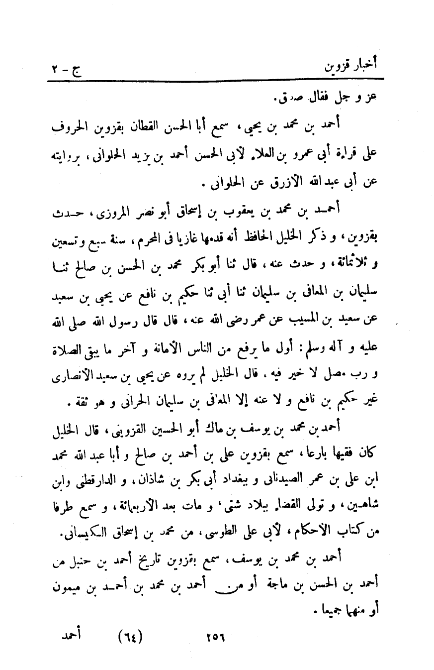 أَحْمَد بْن مُحَمَّد بْن يعقوب بْن إسحاق أَبُو نصر المروزي حدث بِقَزْوِينَ وذكر الخليل الحافظ أنه قدمها غازيا فِي المحرم سنة سبع وتسعين وثلاثمائة وحدث عَنْهُ قَالَ ثنا أَبُو بَكْرٍ مُحَمَّدُ بْنُ الْحَسَنِ بْنِ صَالِحٍ ثنا سُلَيْمَانُ بْنُ الْمُعَافَى بْنُ سُلَيْمَانَ ثَنَا أَبُي ثَنَا حَكِيمُ بْنُ نَافِعٍ عَنْ يَحْيَى بْنِ سَعِيدٍ عَنْ سَعِيدِ بْنِ الْمُسَيِّبِ عَنْ عُمَرَ رَضِيَ اللَّهُ عَنْهُ قَالَ: قَالَ رَسُولُ اللَّهِ صَلَّى اللَّهُ عَلَيْهِ وَآلِهِ وَسَلَّمَ: "أَوَّلُ مَا يُرْفَعُ مِنَ النَّاسِ الأَمَانَةُ وَآخِرُ مَا يَبْقَى الصَّلاةُ وَرُبَّ مُصَلٍّ لا خَيْرَ فِيهِ" قَالَ الْخَلِيلُ لَمْ يَرْوِهِ عَنْ يحيى بن سعيد الأنصاري غير حكيم بْن نافع ولا عَنْهُ إلا المعافى بْن سليمان الحراني وهو ثقة.