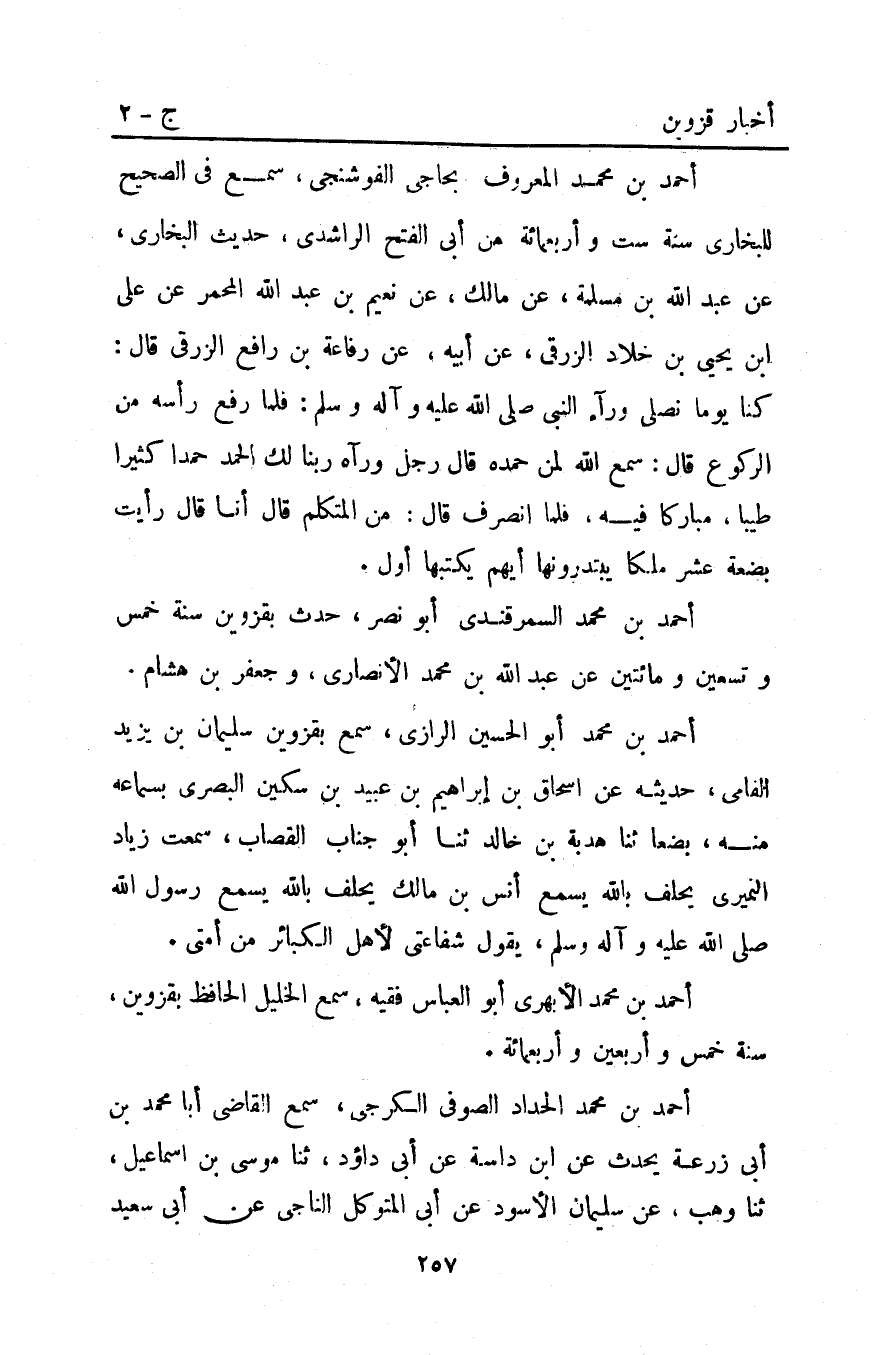 أَحْمَد بْنُ مُحَمَّدٍ الْمَعْرُوفُ بِحَاجِّيٍّ الْفُوشَنْجِيُّ سَمِعَ فِي الصَّحِيحِ لِلْبُخَارِيِّ سنة ست وأربعمائة مِنْ أَبِي الْفَتْحِ الرَّاشِدِيِّ حَدِيثَ البخاري عن عبد الله بْنِ مَسْلَمَةَ عَنْ مَالِكٍ عَنْ نعيم بن عبد الله المحمر عن علي ابن يَحْيَى بْنِ خَلادٍ الزُّرْقِيِّ عَنْ أَبِيهِ عَنْ رِفَاعَةَ بْنِ رَافِعٍ الزُّرْقِيِّ قَالَ كُنَّا يَوْمًا نُصَلِّي وَرَاءَ النَّبِيِّ صَلَّى اللَّهُ عَلَيْهِ وآله وَسَلَّمَ فَلَمَّا رَفَعَ رَأْسَهُ مِنَ الرُّكُوعِ قَالَ سَمِعَ اللَّهُ لِمَنْ حمده قال رجل ورآه رَبَّنَا لَكَ الْحَمْدُ حَمْدًا كَثِيرًا طَيِّبًا مُبَارَكًا فِيهِ فَلَمَّا انْصَرَفَ قَالَ: "مَنِ الْمُتَكَلِّمُ" قَالَ أَنَا قَالَ: "رَأَيْتُ بِضْعَةَ عَشَرَ مَلَكًا يَبْتَدِرُونَهَا أَيُّهُمْ يَكْتُبُهَا أَوَّلُ".